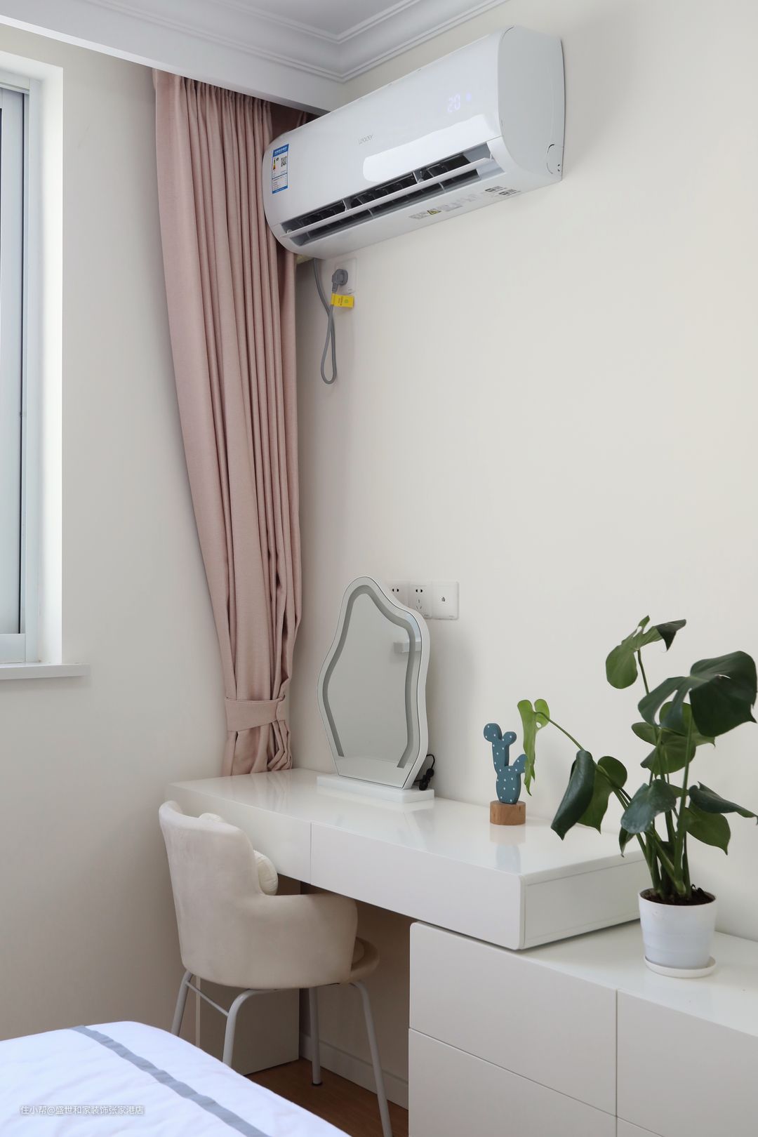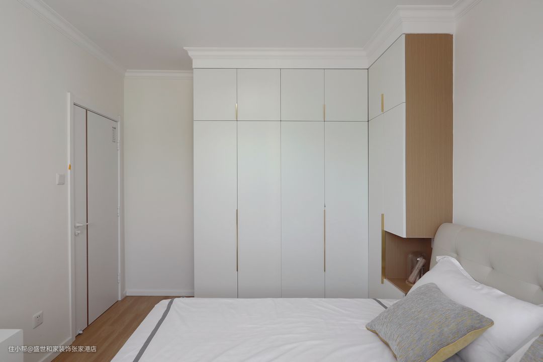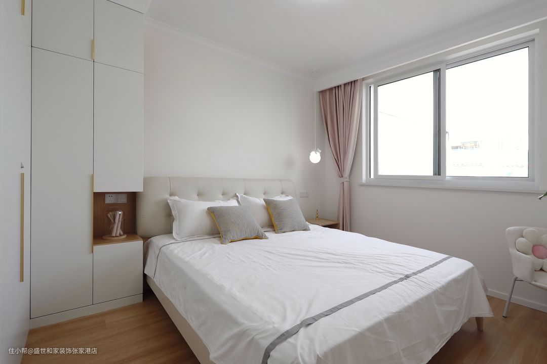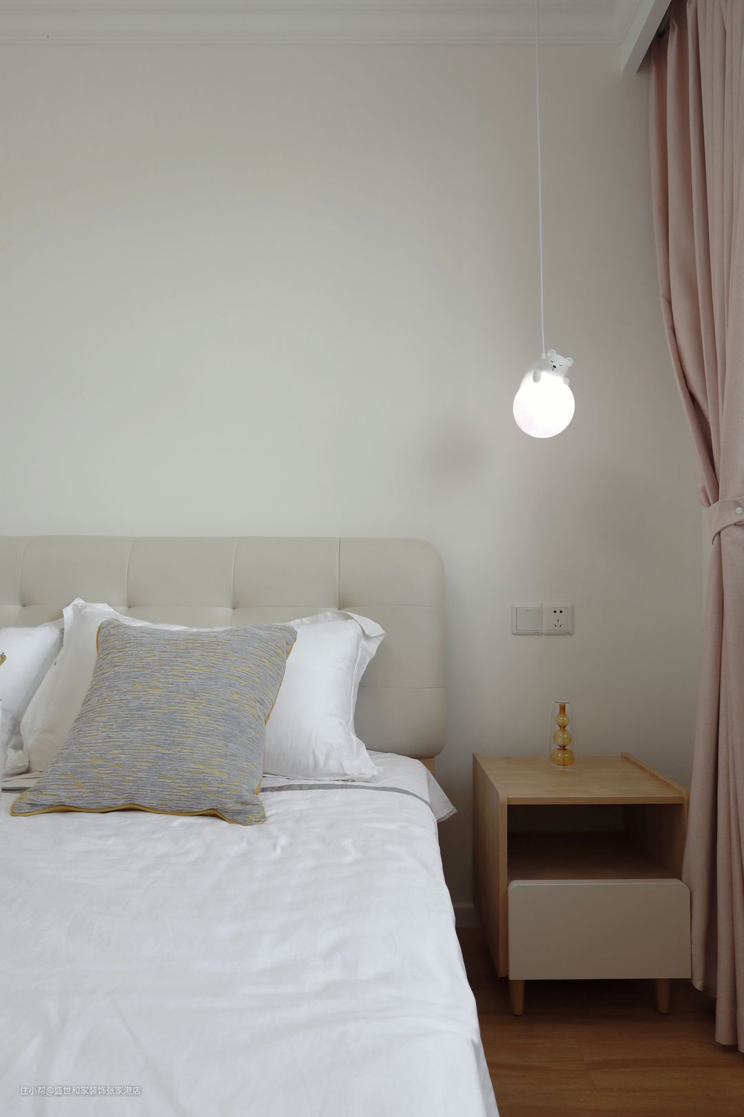 1 主卧以木色与白色为主,简洁的直线吊顶避免层高被压低。 2 L型衣柜兼顾床头柜功能,衣柜顶部以吊顶填充,增加空间整体性。 3 床头以小熊球形吊灯为辅照明,低饱和色调更回归质朴本身。 4 床尾放置梳妆台,增加日常储物的同时,也能满足屋主的爱美之心。