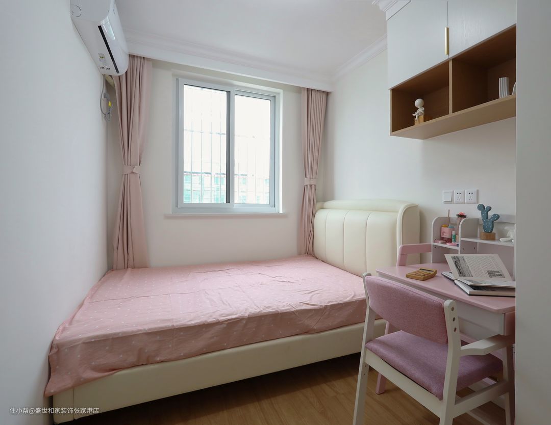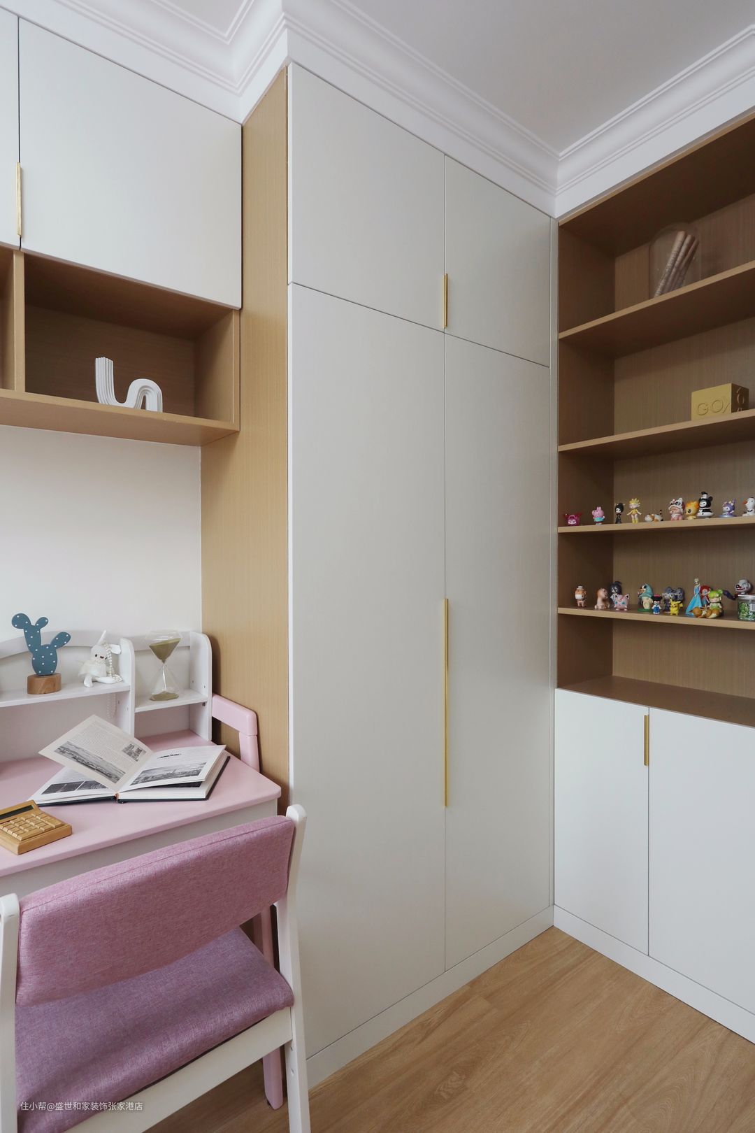 1 女儿房硬装依然以木色与白色为主,在软装上利用粉色来装饰空间。 2 利用房门后的空间,做足够的收纳柜与开放格,将空间合理规划。