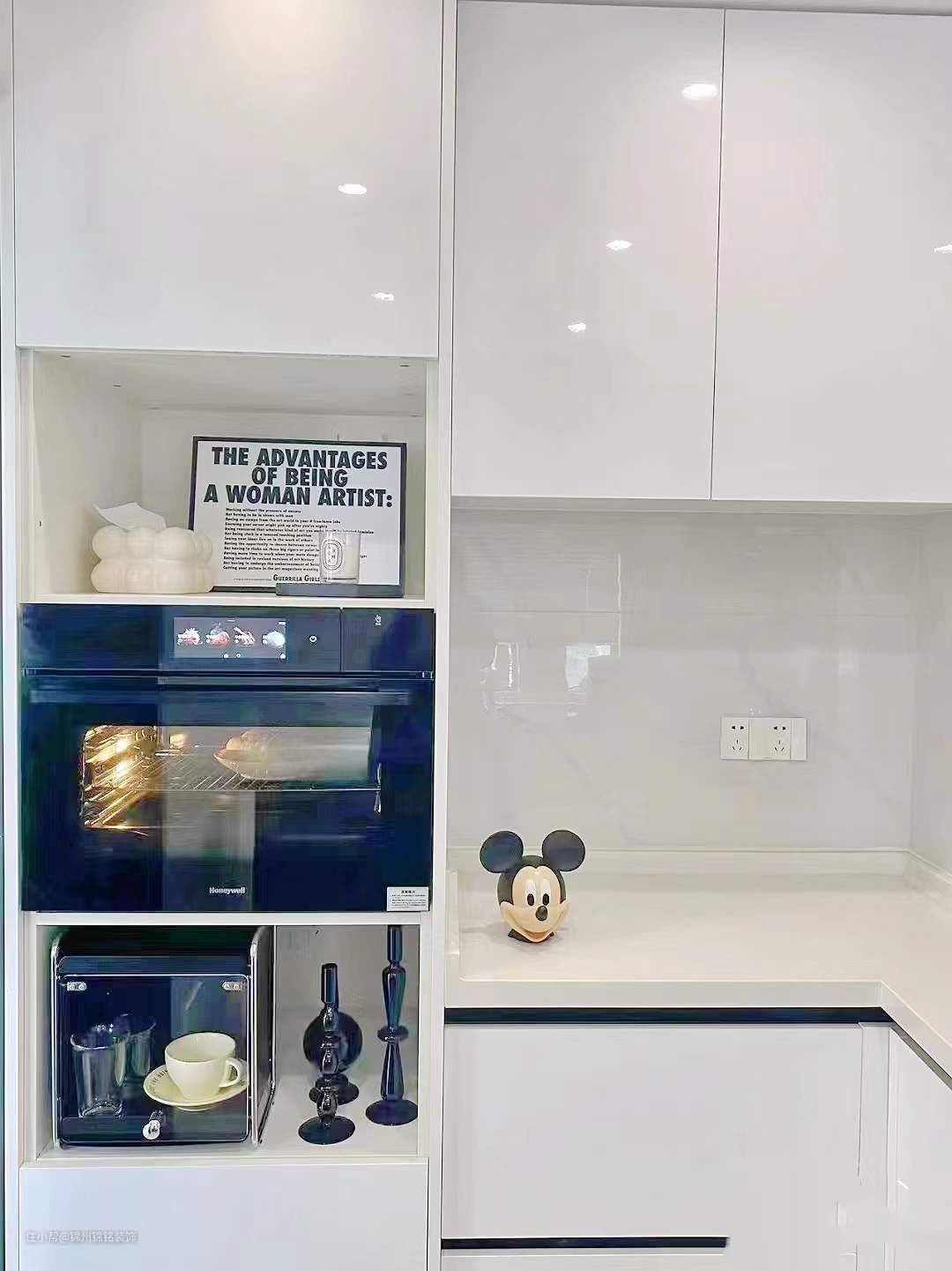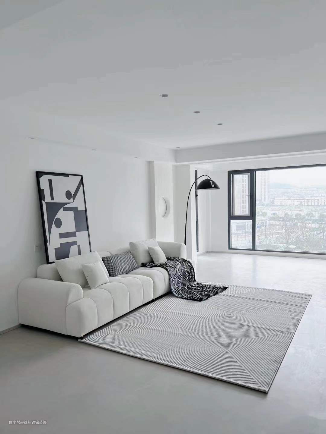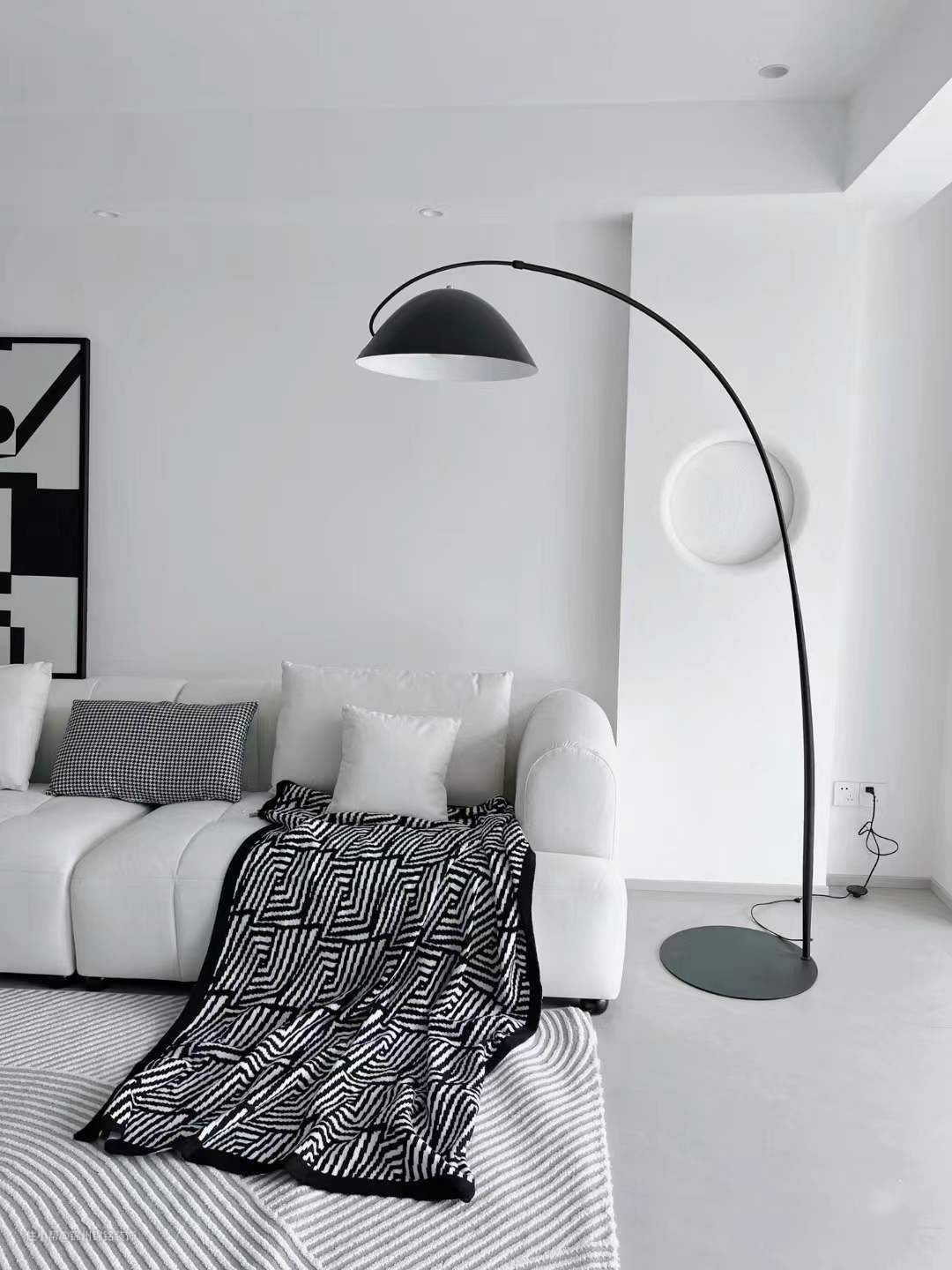 黑色钓鱼灯,家里的氛围感就靠它,不刺眼。客厅挂画,黑白奶茶色系,设计感强。