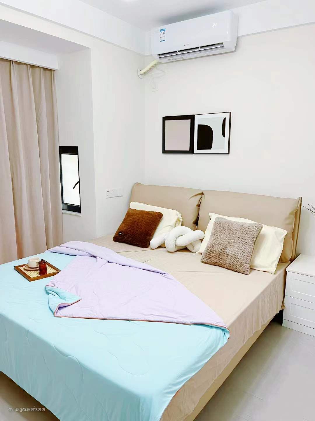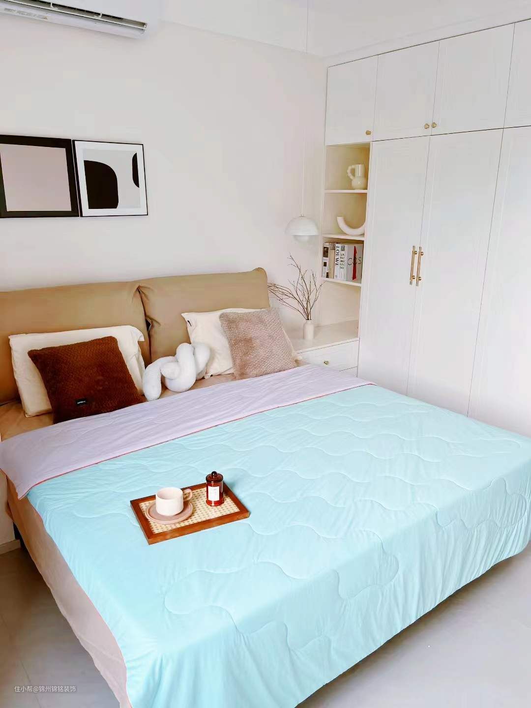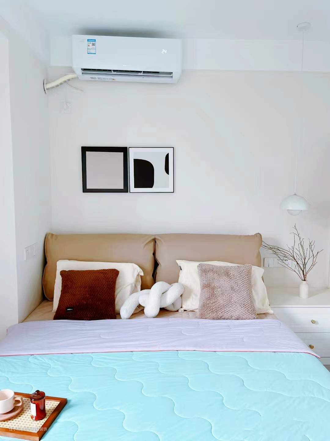 木工打的回字形衣柜,没有复杂背景墙,可可蛋奶通刷。大象耳朵皮床,咖色简单又耐看,排骨架质量不错,三个成人站上面也不会塌。
