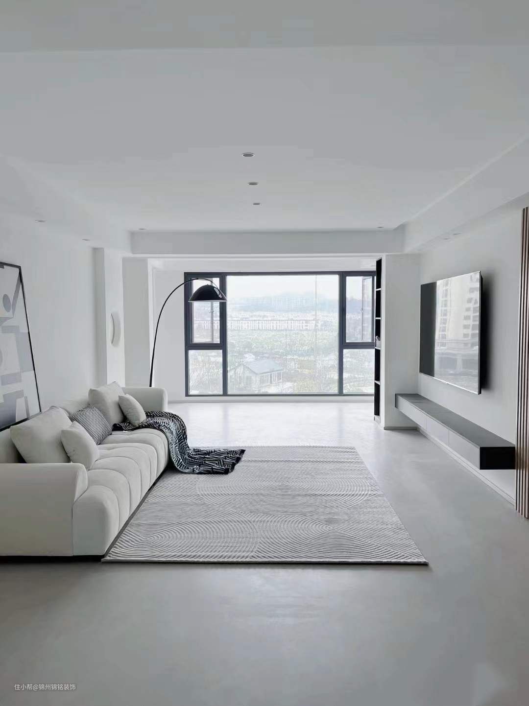 客厅乳胶漆,客 厅通刷菱花白,简单耐看。 通铺75*150瓷砖,配同色系美缝。奶油色沙发,猫爪布耐用又好看,坐感舒适。
