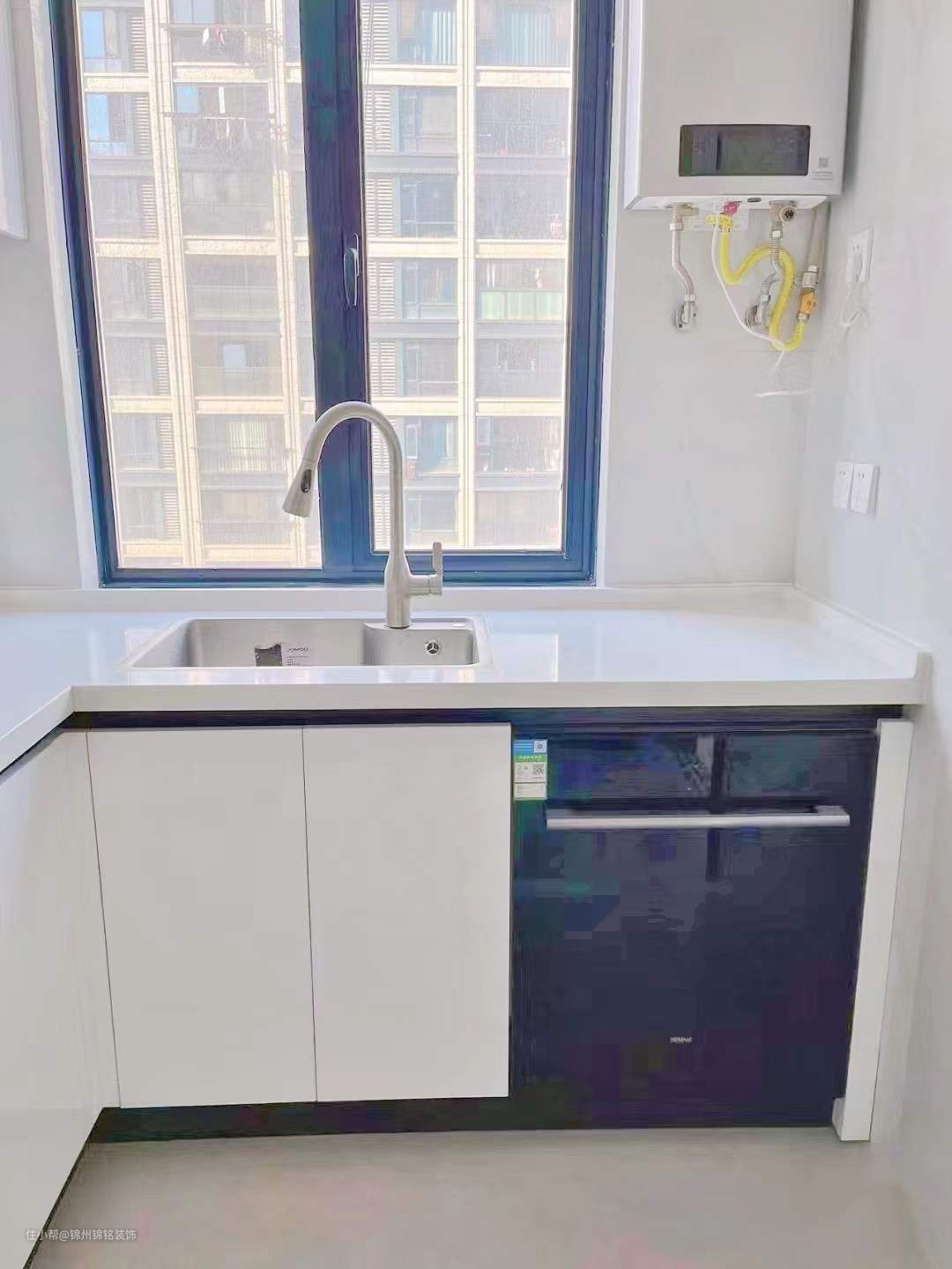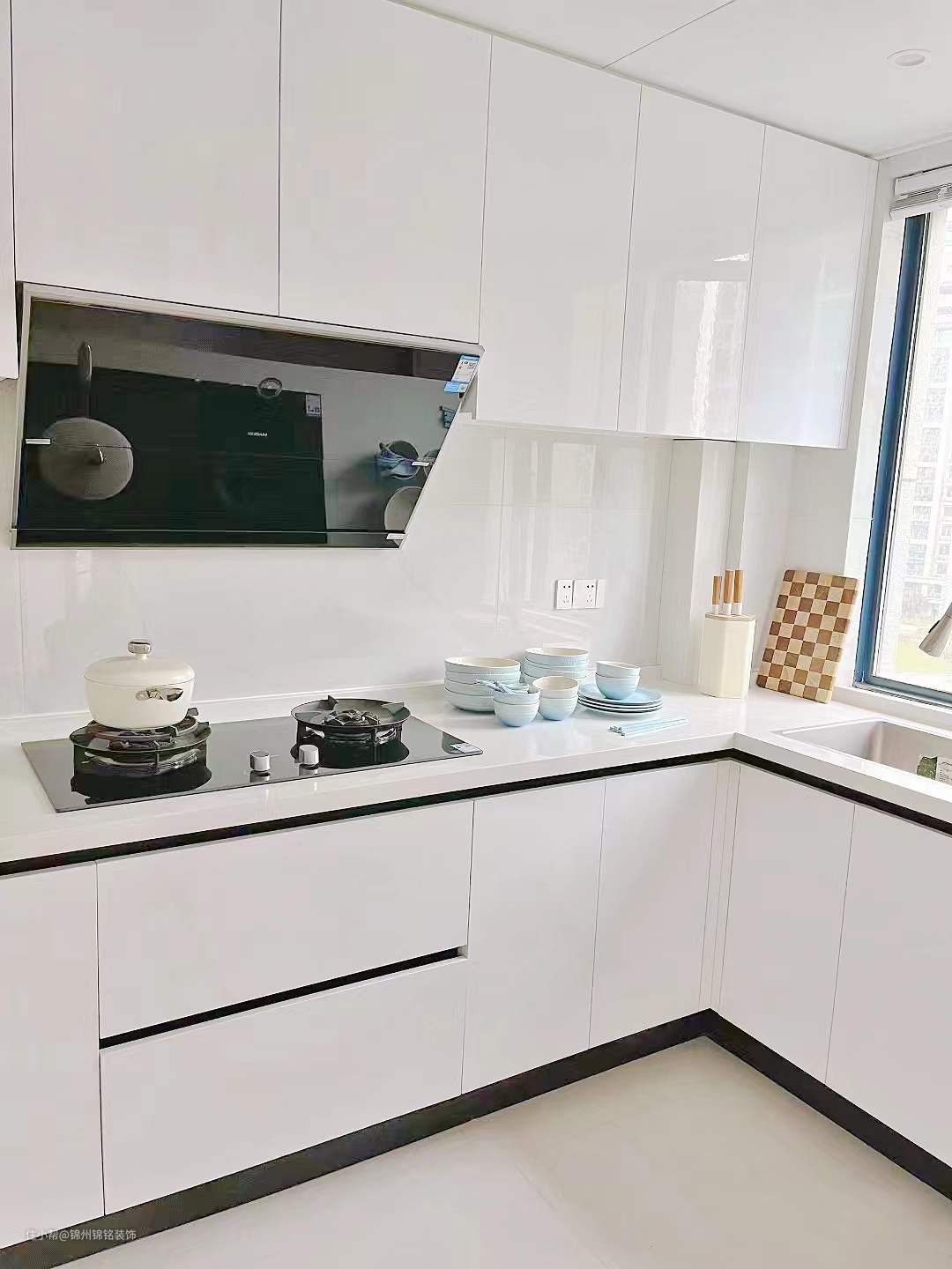 纯白pet门板,柜体多层实木。 上层打了吊柜,实用又方便。鱼肚白瓷砖,配银色美缝,简约高级。 一体挡水条,内嵌金属拉手。