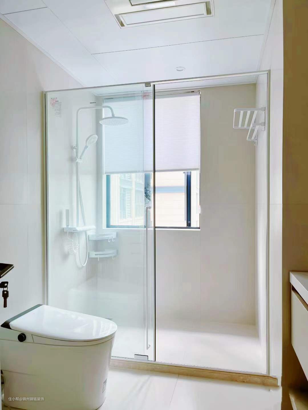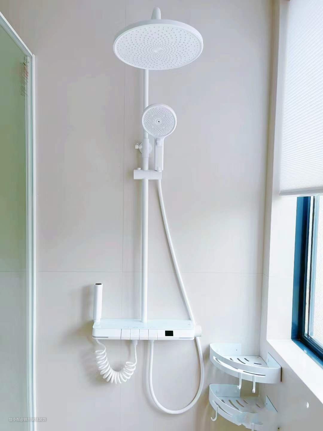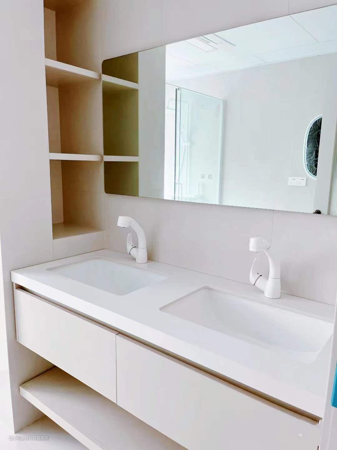 60*120奶油哑光砖墙地通铺,配同色系美缝,干净清爽。淋浴房是极窄白色边框,花洒也是纯白色,数显恒温款,使用感更好。浴室柜是定制的双台盆,配了白色水龙头和下水器。墙边多出来的地方做了壁龛,实用性更强。