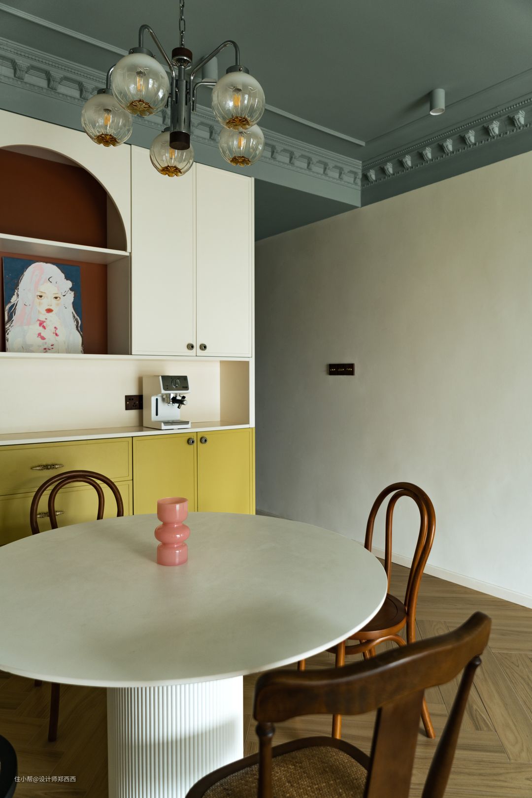 软装搭配尝试让椅子多一些形式会更“热闹” 餐桌吊灯选用了不锈钢材质,现代的材料的灯体保留了多头吊灯一些复古的细节。 接触的年轻客户较多,大多数居住人口是2-4个人组成,当然也有一部份独居。他们都总结,如果不过多考虑朋友在家聚会,单纯只是自己家人使用餐厅的场景。他们会比较愿意接受直径1000-1200的小圆桌。 也许我们需要,在四处出现的曲线中感受法式的柔和和感性;从留白的空间去感受风格的严谨;从空间的绿调色彩氛围去体会法式所追寻的自然气质。 我会去选择一些有趣的把手,功能和视觉两不误。 餐椅在选择上也会找一些中古风的椅子,有简约的元素也有自然复古的元素。 ▲施工过程的花絮 ▲全屋定制部分,跟墙漆同色的板材都会打样,跟色卡无差别即下单定做。