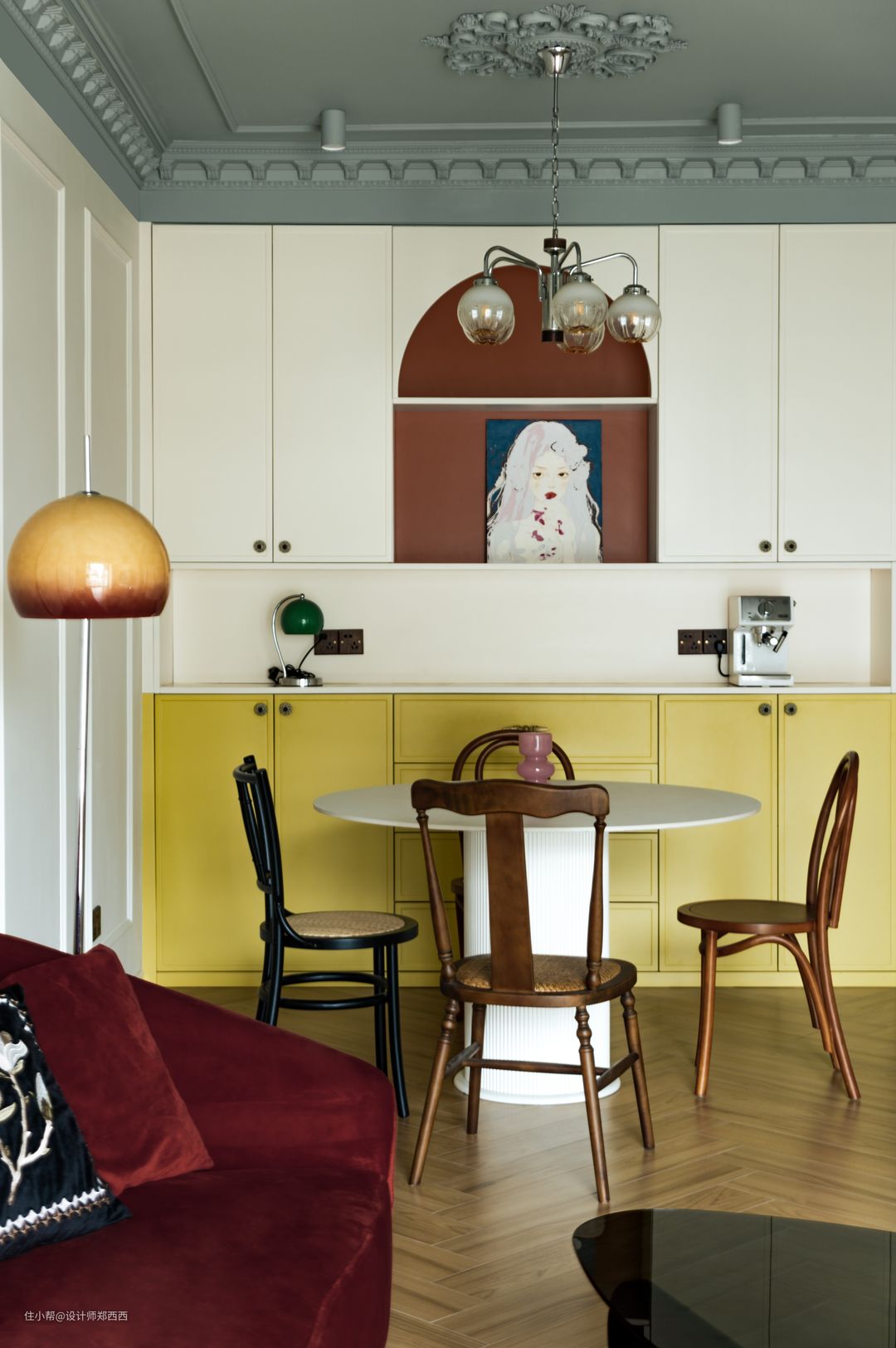 1、吊顶利用其原顶进行设计,绿色吊顶连接的玄关的吊顶为一个整体,空间的顶部不一定要是白色,单独赋予一种颜色可以使空间上中下三个部分更有层次感,视觉上会更加凸显立面。 2、墙面的角线整齐排列,竖向的排列是在营造出一种秩序,好秩序可以在视觉上形成美感,而且可以拉伸层高。墙面的线条的简洁性跟天花角线的复杂性相互对比,一轻一重的节奏。 3、客厅顶部的照明用的是明装筒灯,筒灯灯体也刷了跟天花一样的色彩。 全房绿色色号:30GY 30/100(多乐士) 轻法式复古可以有很多营造方式,本案中我运用了一些经典的色彩搭配,利用色彩和空间的结合,去挖掘居住者对于对于空间的想象。因为我始终相信,色彩可以改变空间;色彩可以将物体分类;色彩会作用于人的心理,也会对人的感觉予以回应。 红黄色是三个基础色,绿色能联想到植物的色彩,植物的色彩往往是空间情感意境营造的核心元素,搭配个性的黄色和热情深红色,即构成瑰丽多彩的景观,并赋予环境活力的性格。 客厅与阳台之间的垭口进行半弧形圆角,过渡客厅与阳台之间的关系;客餐厅和阳台统一考虑,能达到让客厅显得更大的目的。 我曾经读过一句话“通过多样的色彩,不论是雄浑的、温和的还是狂暴的色调,我们都可以为建筑带来令人激动的效果。” 沙发旁边的壁灯选择的是铜色灯体和米黄色灯罩,金色作为空间的点缀。 壁灯也可以在阅读或是休闲的时候提供照明,在立面的表达上也是一种装饰。 曲线和直线,永远都是一种最简约的对比,比如沙发和背景,或是茶几和背景的对比,都能找到对比关系。 整个沙发背景墙是统一的一面墙,也是作为餐厅的背景墙,这样客餐厅在功能分区后也能显得比较连贯和整体。所以就能显得空间更大不拥挤。 1、电视柜和电视机和过道的两个拱门一起的划分着空间立面的比例,在视觉上达到一种平衡。 2、为了不让家电在风格化空间中显得格格不入,给空调挂机设计了一个“家”,视觉上确实弱化了很多。 全房橘色色号:50YR 21/318 (多乐士) 电视柜通过悬挑的方式,表达的是简约的形式;同时悬挑对于日常保洁比较方便,也不会因为落地看起来比较占地方。 洗衣机和烘干机都在阳台,阳台天花顶部设置隐藏式升降晾衣杆搭配家政功能区使用。 客厅本来计划是铺设木纹砖,但是最终还是选择了木纹砖,在现场对比了几个小样,选择了一款比较接近木纹材质的。