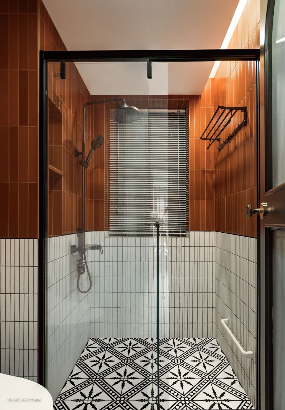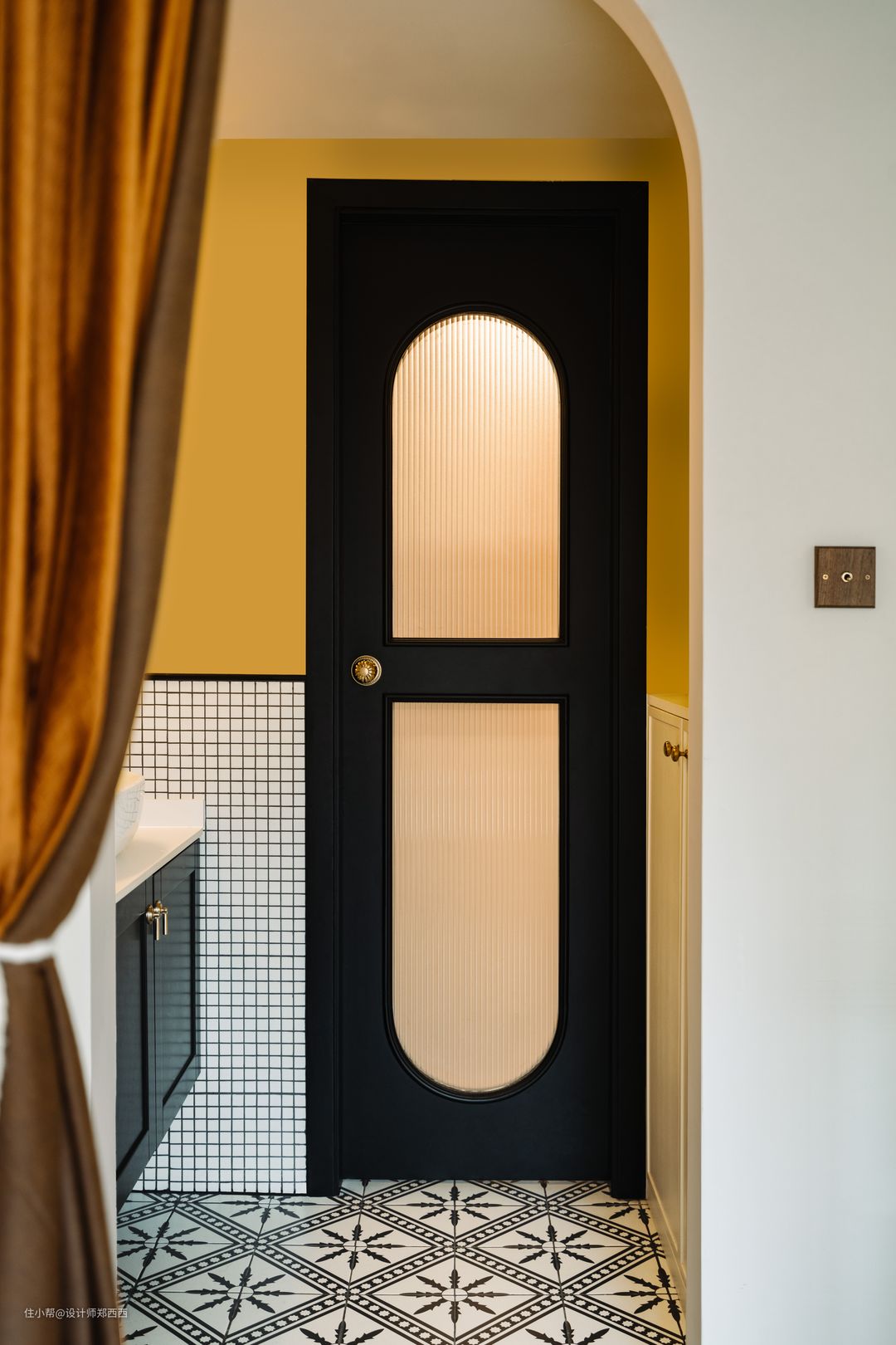 从书房往卫生间干区的角度看,也是一道风景。 1、卫生间干区开放在过道,相比原始结构卫生间是扩大了; 2、除了洗手台下方柜子,干区洗手台后方有单独的储物薄柜也是计划预留的。相比在台盆上面储物,这里其实也非常方便使用,也显得干区更宽敞。 3、卫生间门透光不透人,圆弧的设计元素与干区拱门相互重叠,透视下,弧线空间柔化的很优美,刚柔并济令人放下戒备。 全房黄色色号:40YY 49/408 (多乐士) 镜前灯对于面部的照明非常关键,而台上筒灯才是服务于洗手台的,所以在灯光上两者不可缺一;洗手台利用半墙马赛克砖和腰线的设计去营造有层次的复古感,足够的高度在功能上也能保护水不会溅到墙面。 屋主对于干区选择的是台上盆,加强了台盆的仪式感和围合感。 利用黑白灰的砖跟黑色的柜子进行搭配,利用明黄色的墙漆和金色的洁具去进行搭配和呼应。明亮的金黄色具有强烈的视觉冲击力,黑色庄重而高压高雅,与温暖的黄色相碰撞,会更加有光泽和精致。 镜前灯选择一个或是两个都可以,一半对称式的设计买一对很有仪式感,视觉也协调。 1、三分离的卫生间更好的保证马桶区域和洗手台区域的舒适感, 2、橘红色的墙砖在卫生间运用主打的是自然和谐,卫生间是一个需要安心的地方,跟黑色一样,大地色可以使人放松警惕。 3、卫生间的灯光以氛围为主,设置了灯带去让暖光照明空间。 2、 墙面利用原始管道墙面空隙处设置了壁龛。