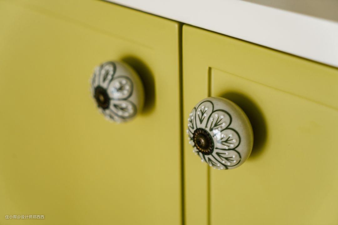 房把原来的小生活阳台纳入进来后变得比较大,所以就有了足够大的操作空间。因为只有一个小窗户厨房几乎没有采光,所以选材上尽可能选择了浅色系进行搭配。白色花地砖和墙面的白色面包砖去搭配浅蓝色橱柜,简洁干净,操作起来也很明亮,看起来比较有食欲。 燃气炉安装在柜子内,这样可以遮挡很多杂乱的管线,按照规范,柜门应使用百叶等透气形式柜门。