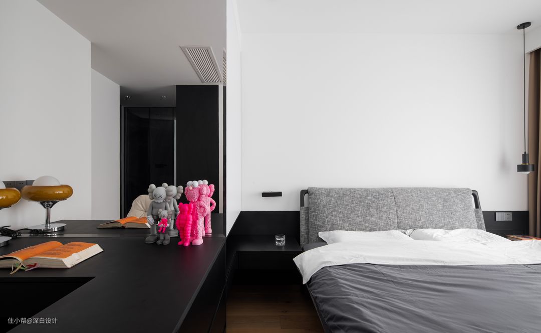 ·主卧将卫浴分离后,拥有了更开阔的空间进行功能的统筹规划。衣帽间、梳妆台、办公区以及睡眠区都得以实现,让宽敞的卧室空间表现出更加丰富的功能。置放细腿双人床,形态轻盈利落,方便扫地机器人工作,杜绝卫生死角,结合简洁轻柔的床品,帮助屋主实现优质睡眠。 ·床头背景墙精简化处理,黑色半高饰面板一直延伸到梳妆台区,刻画完整的空间结构。明镜饰面的融入,不仅提升了梳妆区的开阔感,在视觉上的延展度,也让整个卧室看起来更加通透大方。 ·床头悬吊小灯,营造睡前阅读的舒缓氛围。 ·梳妆台定制矮柜与墙面保持齐平,利用黑白色系进行分区,墙面增设一组嵌入式壁柜,再次扩充卧室收纳空间。同时在进门处打造L型衣柜,构建步入式衣帽间,黑色衣柜与白色墙面达成鲜明对比,明确区域的划分,让空间更有层次感。 ·梳妆台增加一盏台灯,提升区域采光,必要时也可以作为书桌使用,不论是阅读还是办公,都能拥有独立且安静的环境,效率更高!