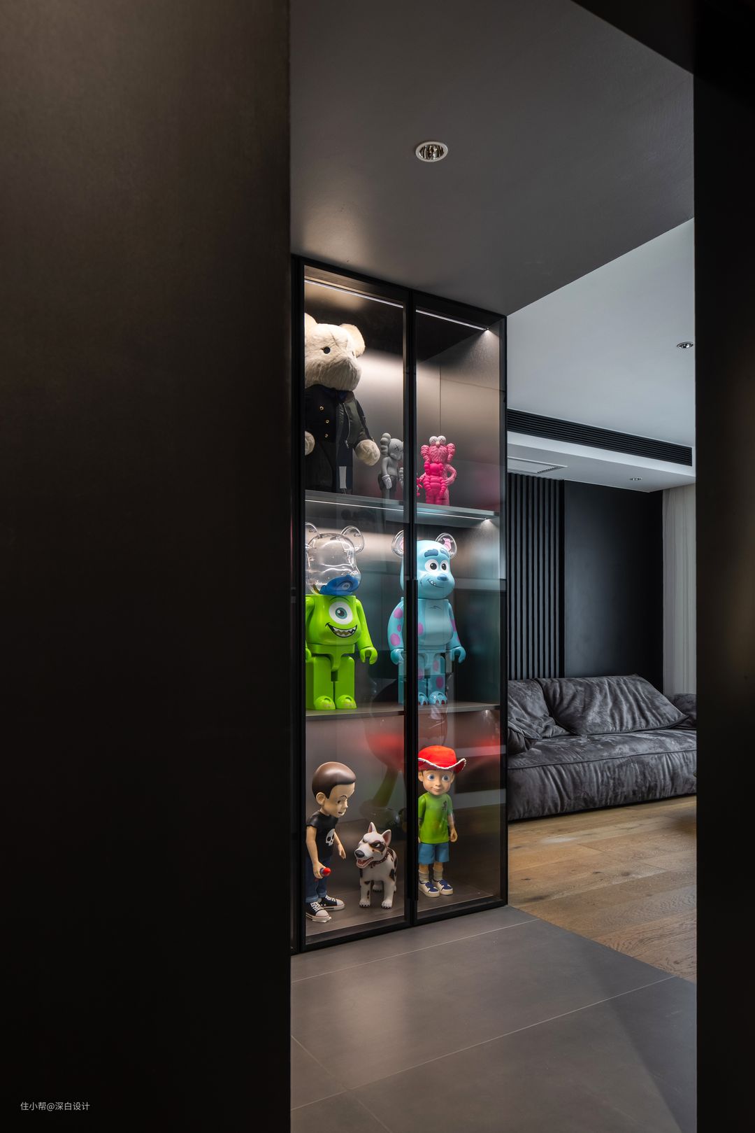 ·入户是一段通往客厅与餐厅的双向走道,利用吊顶高度差强调与其他空间的层次感,同时沿墙做一门到顶的鞋柜+展示柜组合,实现物品分区收纳,也能对玄关进行装饰。 ·展示柜按需求定制尺寸,将屋主的大型潮玩手办统一收纳,完美展示,外用黑色窄框玻璃柜门,内嵌感应灯带,美观度满分。 ·统一的封闭柜门可以减少落尘,也对屋主的珍藏进行了更好的保护!