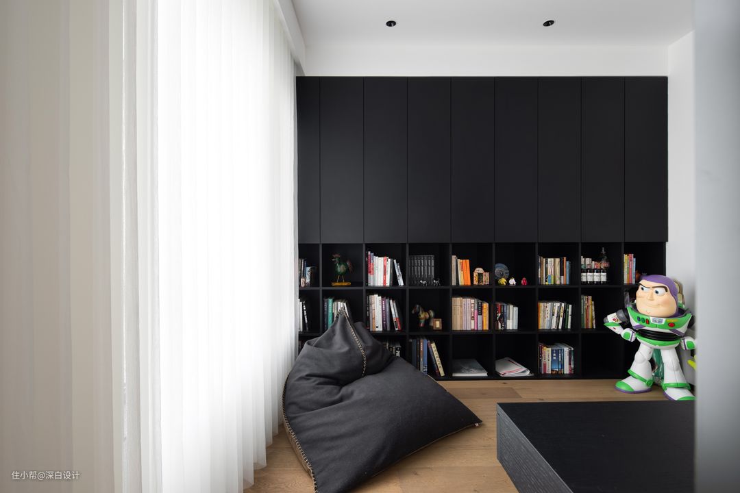 ·将次卧原有的隔墙拆除,改造为多功能书房,做半墙隔断,同时也是电视背景墙,一墙两用,客厅与书房开放并联,扩大两个空间的采光面,也让活动动线更加自由。 ·沿矮墙布局办公桌椅,简易造型打造实用功能区,宽敞的桌面让办公更加轻松付,同时半墙的高度正好可以阻绝视觉干扰,帮助注意力的集中,居家办公效率更高。 ·充满秩序的书房,功能布局在两侧,将中部空间释放出来,形成视觉上的开阔与舒适感。 ·过道零碎空间利用起来,增设满墙柜来收纳各种书籍,不浪费每一寸空间,摆上小沙发、地毯以及屋主心爱的手办,规划出一个小型休闲区。 ·黑色储物柜采用上下分区的形式,上方构建无把手封闭柜,补充客厅的收纳需求;下方做开放格柜,可以用来展示各类书籍。不同的高度考虑到了小主人不同的成长阶段,方便养成阅读以及自主收纳的好习惯。 ·梦幻帘的加入,自动过滤自然光线,空间氛围柔和治愈,适合午后静坐或是小憩,身体和思绪也随之娴静下来。 ·半墙隔断的构筑,让两个功能区有着无法忽略的亲密感,同时增加了空间的互动感,在不同的空间内各自忙碌,但又能及时地进行交流,让居家时光更为温馨。