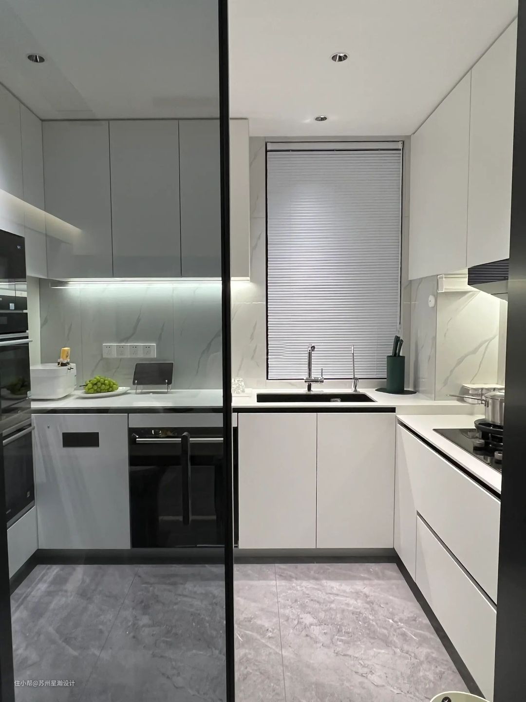 U型极简白色厨房 🏷白色岩板台面和白色肤感柜门搭配 🏷防水石膏板吊顶,让空间更显大 🏷厨房的高柜设计,女主人特别满意,冰箱、蒸箱、烤箱、微波炉全部收进高柜 🏷洗菜区台面90公分、炒菜区84公分,洗菜不用弯腰,炒菜手臂也不用抬高 🏷洗碗机、垃圾处理器也都是收拾厨房的好帮手