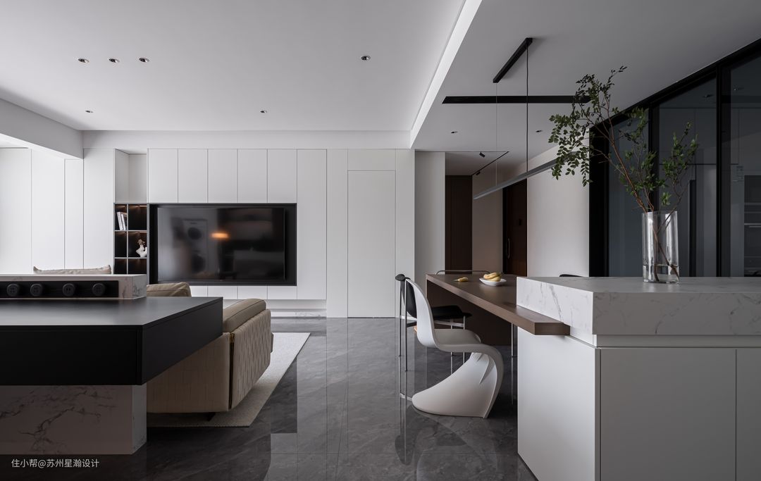 整个客餐厅,阳台,厨房,采用了750×1500大砖通铺,没有过门石 🏷客厅的极窄暗藏踢脚线在铺砖前凿出隐藏踢脚线的槽,在油漆阶段预埋安装 🏷 全屋无主灯设计很有氛围感,又能让空间显得更大 🏷 厨房门选择吊柜三联动门,进出动线流畅还方便打扫 🏷无框隐形门,没有了传统门扇厚厚的门框,更符合极简风格 🏷因为女主人有钢琴需求,所以在客厅的背后,融入了钢琴区域,通过一把椅子🪑,实现了钢琴对面临时办公区域的共享功能。 🏷餐岛是整个客餐厅的核心区域,符合我们当下年轻人的居家生活场景
