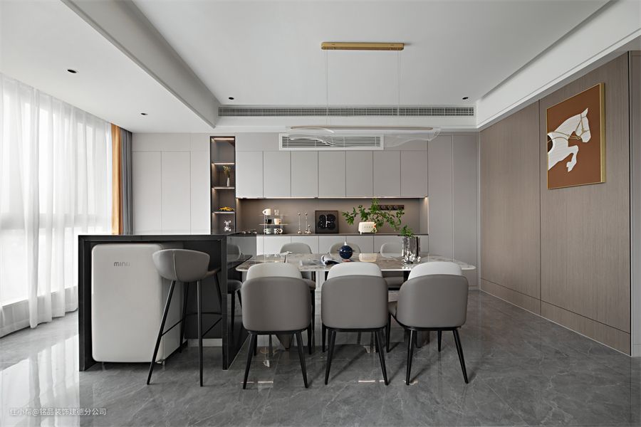把餐厅阳台纳入空间,做了一整排餐边柜,有效的遮盖了消防门。柜门颜色是月牙白+浅棕木,看起来比较温暖宁静。木饰面墙搭配了橙色奔跑马的装饰画,带来一丝活力感。 就餐区是餐桌+岛台的形式,岩板餐桌搭配灰色皮质餐椅,可以同时容纳6人就餐,一侧的岛台用来连接空间,提升空间利用率,可以利用岛台和桌面的高低差做电源插座,平时居家做小火锅也很方便。