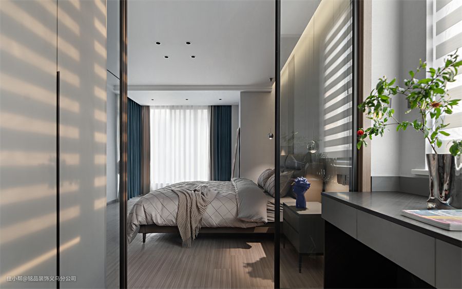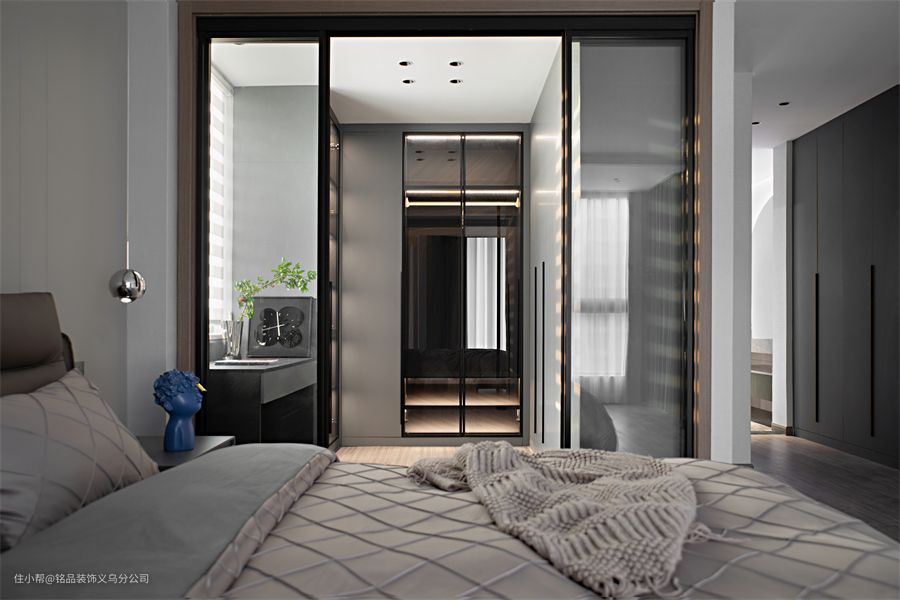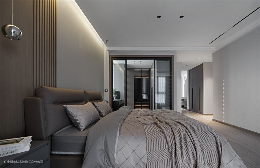 床和床品也搭配了简约的灰色,整体是大气耐看的。从床头望向梳妆区和衣帽间,感受功能区和开阔度。