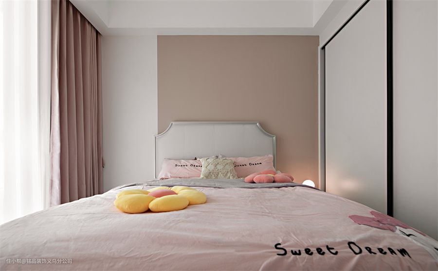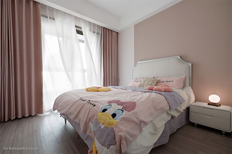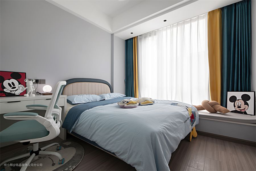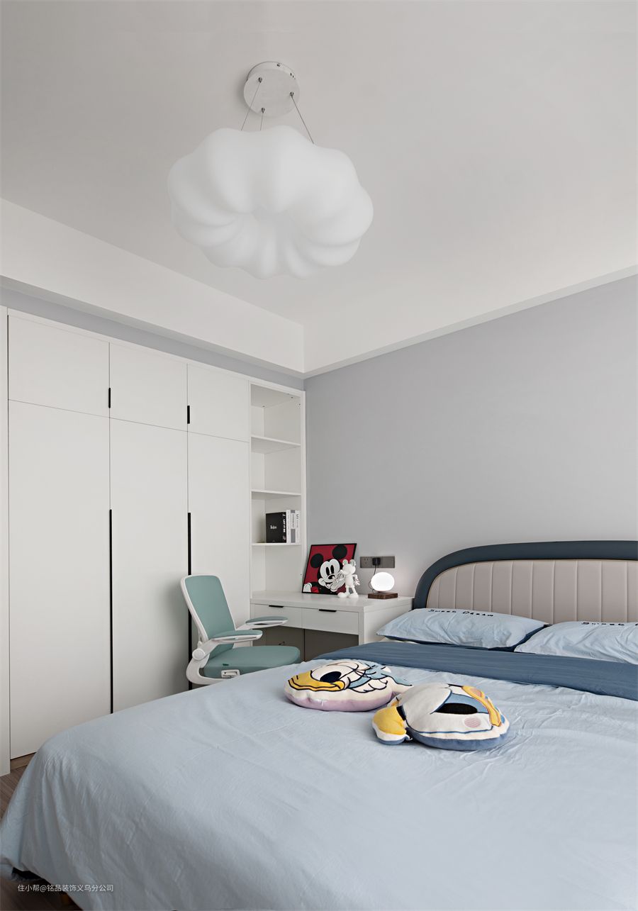 屋主有两个宝宝,一儿一女,都已经到了上学的年龄了,所以在儿童房的设计中,主要还是以实用为主。女儿房以粉色为主色调,在背景墙、窗帘和床品中加入粉色,来营造少女氛围的空间,床品中加入女儿喜欢的唐老鸭元素。 男孩房的设计以灰色+蓝色为主调,展示空间的利落与率性。取消床头柜,放置床头桌,方便给孩子一个学习做作业的空间。一整面墙的衣柜满足了日常储物需求,特意留出一部分做了开放式书架,辅助书桌来使用。