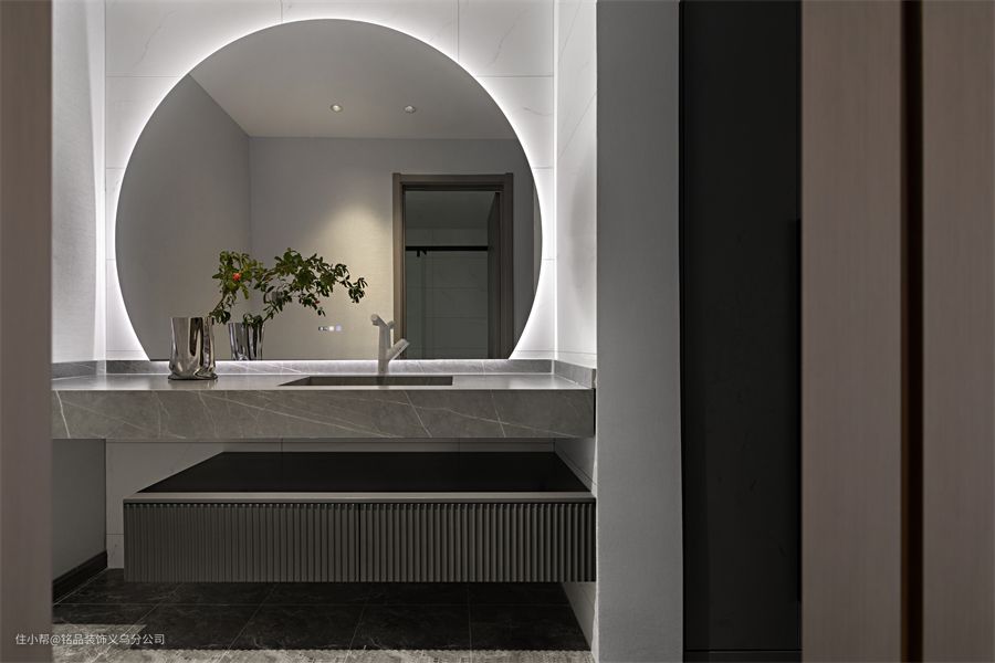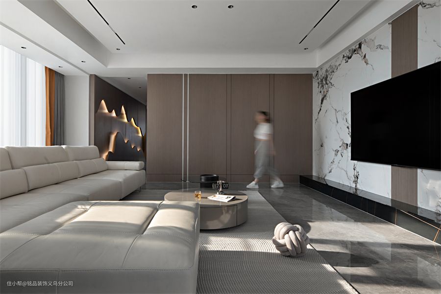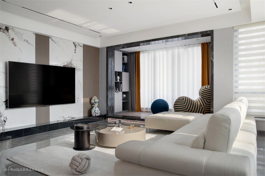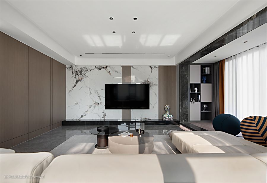 电视背景墙做了白夹灰的大理石设计,其中加入了一些格栅,让墙面看起来没有那么单调,也能和另一面墙做个呼应。木饰面打造的墙面,既为室内带来柔和感,也在这里做了隐形柜的设计,为公区提供收纳。茶几选择了一大一小的圆形茶几,提供日常置物需求,圆形设计没有棱角,避免孩子被磕碰到受伤。