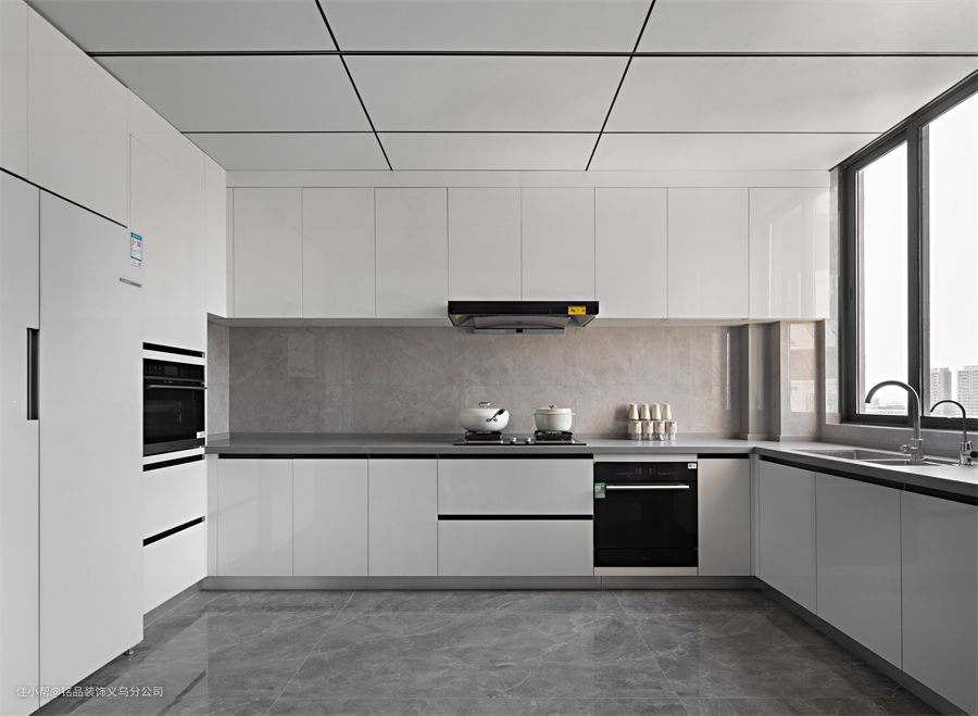 关于布局,采用了最省力的U型布局,方正规则的台面布局,无把手设计的极简橱柜,让强迫症一本满足的存在。整个空间也很宽敞,可以通纳下很多厨房电器和冰箱。