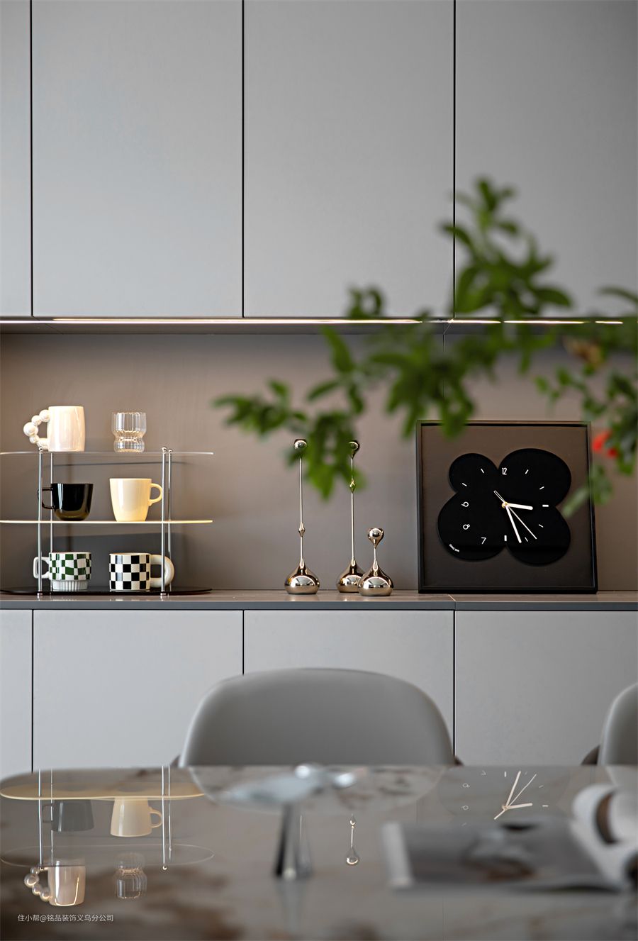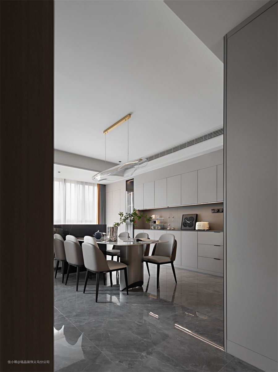 把餐厅阳台纳入空间,做了一整排餐边柜,有效的遮盖了消防门。柜门颜色是月牙白+浅棕木,看起来比较温暖宁静。木饰面墙搭配了橙色奔跑马的装饰画,带来一丝活力感。 就餐区是餐桌+岛台的形式,岩板餐桌搭配灰色皮质餐椅,可以同时容纳6人就餐,一侧的岛台用来连接空间,提升空间利用率,可以利用岛台和桌面的高低差做电源插座,平时居家做小火锅也很方便。
