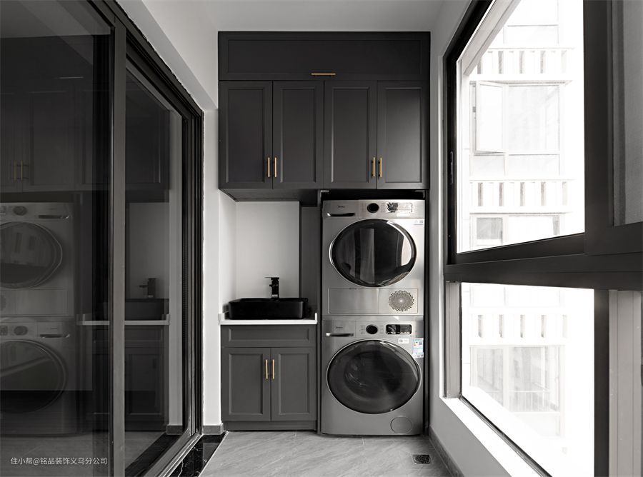 阳台满足生活使用即可,靠墙定制台盆柜和吊柜,洗衣机、烘干机嵌入其中,满足日常洗衣、储物需求。