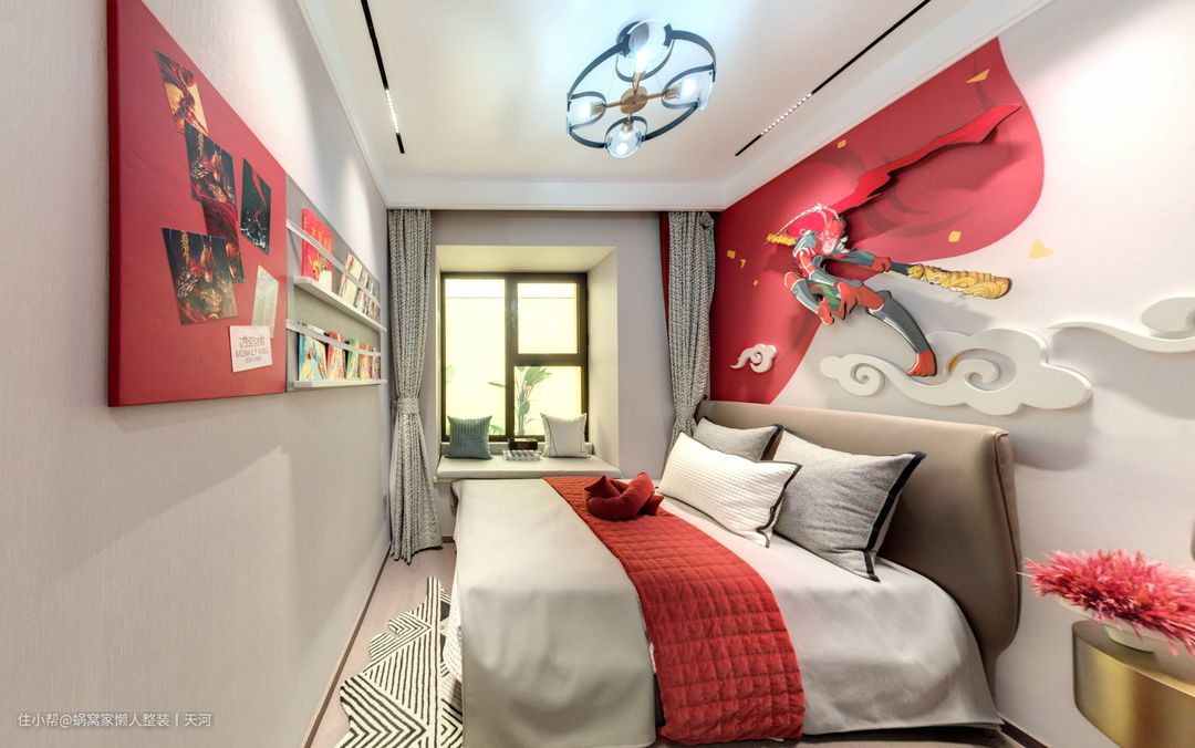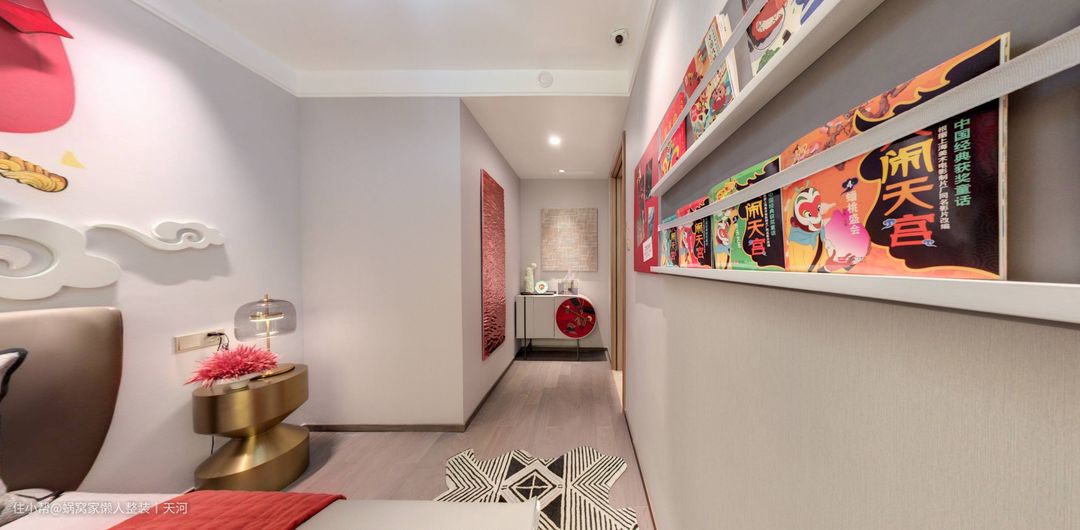次卧走廊十分具有延伸感,扩展我们的视觉空间,同时在次卧进门摆上一个斗柜,让我们视线望过去,空间不会显得单调,斗柜还能为我们提供一个置物空间,十分的便利。 次卧同样采用主灯+辅灯的设计,结合敞亮的飘窗,次卧的采光变得十分丰富,还不失设计感。 粉色系的次卧十分时尚,背景墙的设计更是这个房间的点睛之笔,天马行空的人物增添次卧的趣味性,给我们带来不一样的视觉冲击感~