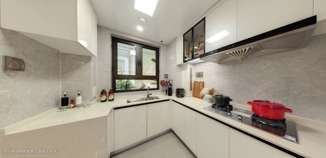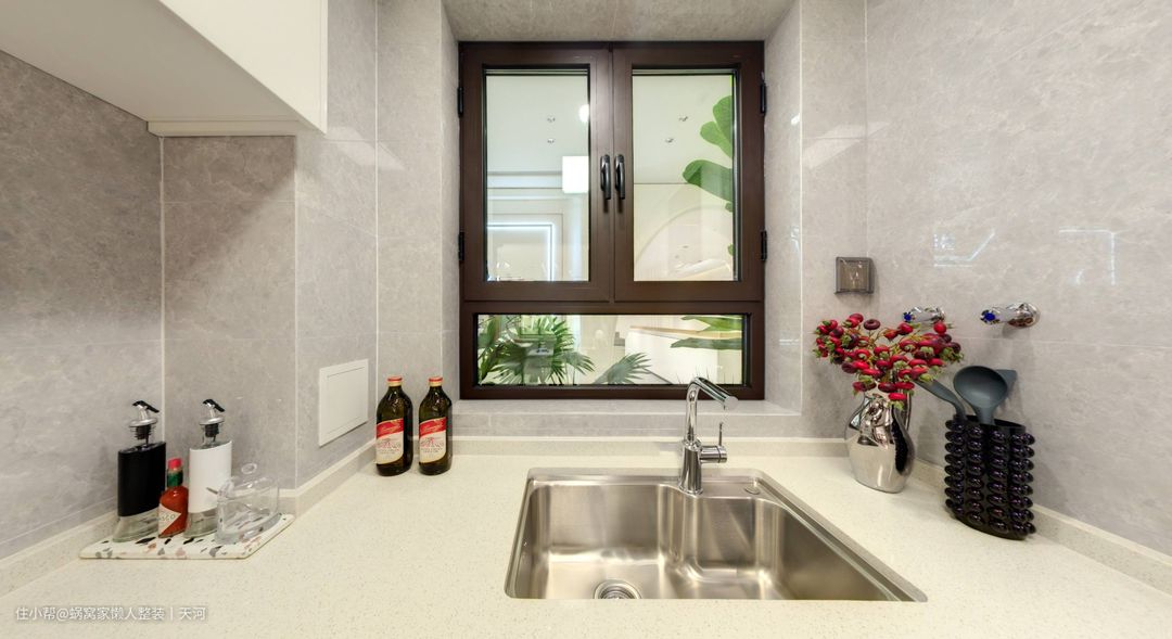 U型的厨房布局,空间宽敞,可以满足多人同时烹饪,能提高过节亦或是聚会时的烹饪效率,既美观又实用。 白色的橱柜增加了厨房的收纳空间,搭配嵌入式抽油烟机的设计,为油烟的排除预留出了充足的空间,打造了一个整洁的厨房环境。 光滑的操作台,搭配四周全铺浅灰色的瓷砖,整个厨房的抗油污性能增强,让业主日常打扫起来更显便捷,时刻保持一个整洁、干净的厨房。