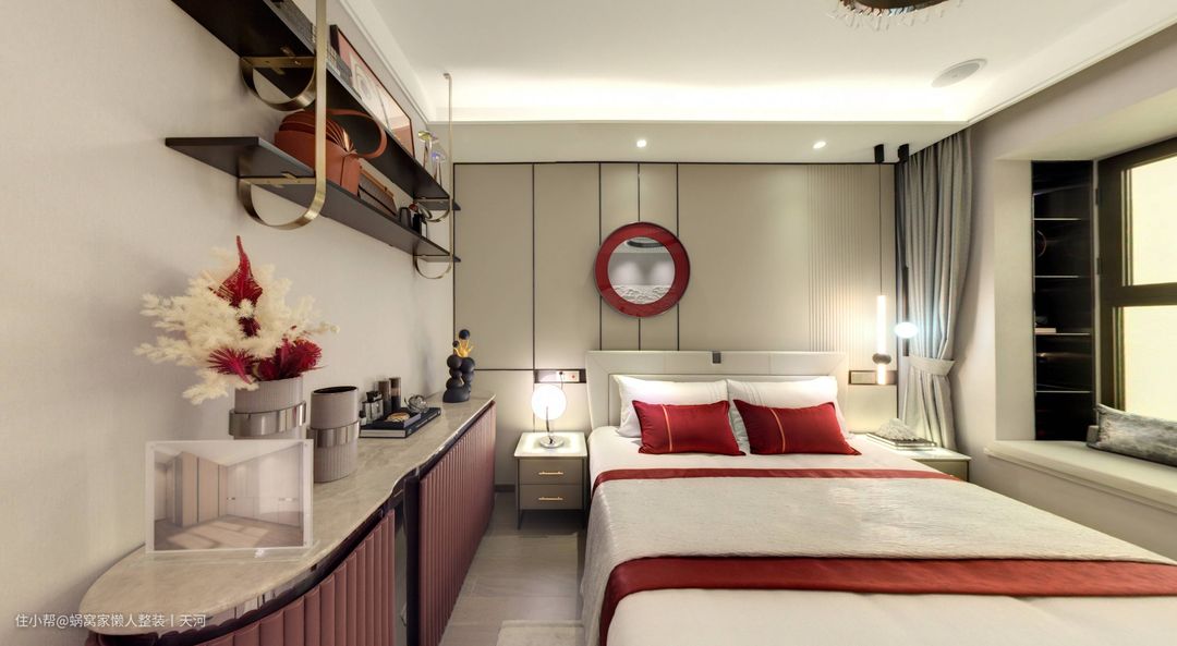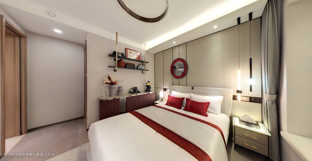 主卧给人一种极为温馨、舒适的氛围,柔和的灯光打在墙上,既能满足我十点额采光需求,还不会因为光线太刺眼而打扰到休息。 斗柜+悬挂的置物架,斗柜增加了卧室的收纳空间,让空间看起来更加整洁,置物架凸显出了主卧的设计感。’ 浅色系的背景墙,搭配有条不紊的黑色线条装饰,主卧背景墙的层次感更为丰富,搭配单边的吊线灯,点缀空间,同样柔和的灯光呼应另一边的台灯,烘托出主卧的温馨氛围感。