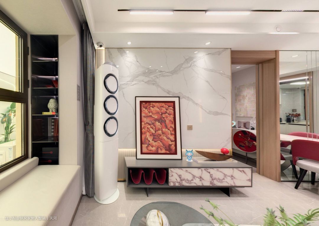 客厅灯光主要由筒灯+灯带+两条轨道灯组合而成,这样的设计,为客厅提供了充足的光线,同时增强了客厅的整体氛围感,满足业主的需求。 客厅通铺浅色的瓷砖,视觉空间十分统一,还能起到延伸视觉空间的妙用,给我们一种超大空间的视觉效果。 客厅不仅灯具搭配有艺术感,客厅阳台一体化后,不仅扩展了客厅的空间,利用房梁位凿除壁龛,更是凸显客厅的设计感。