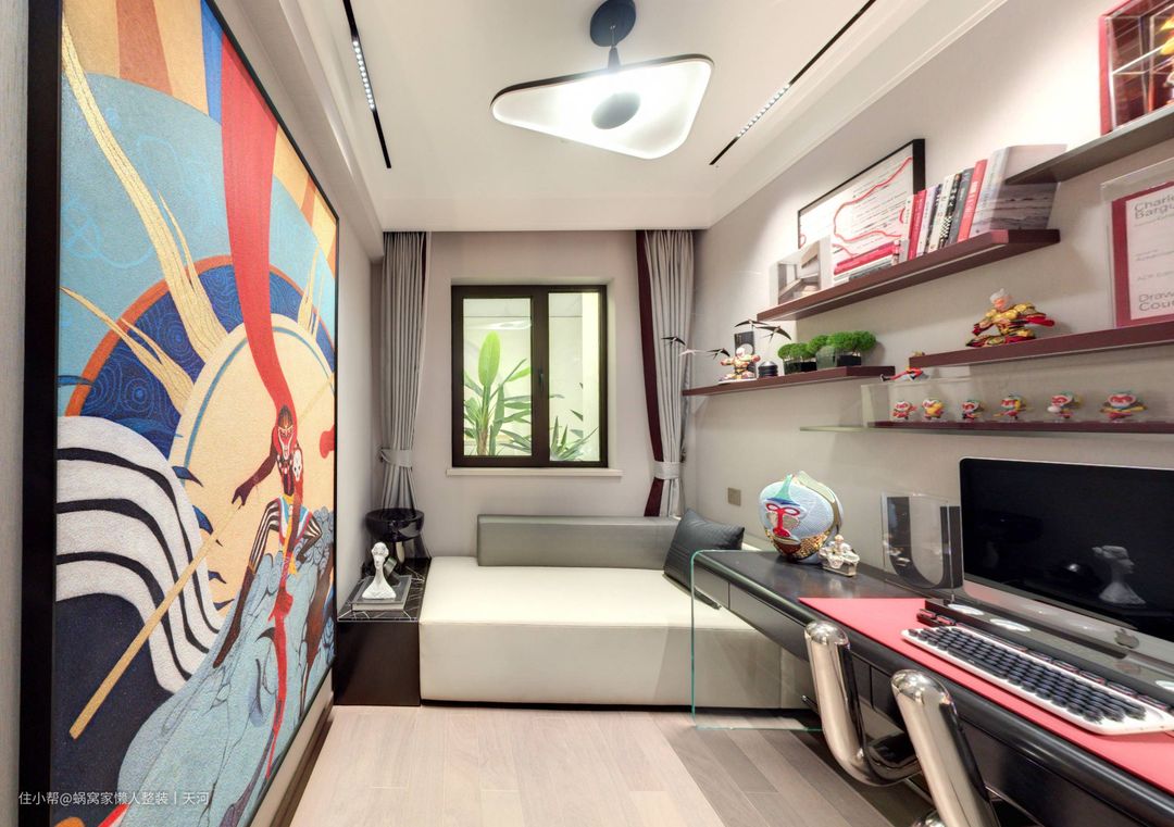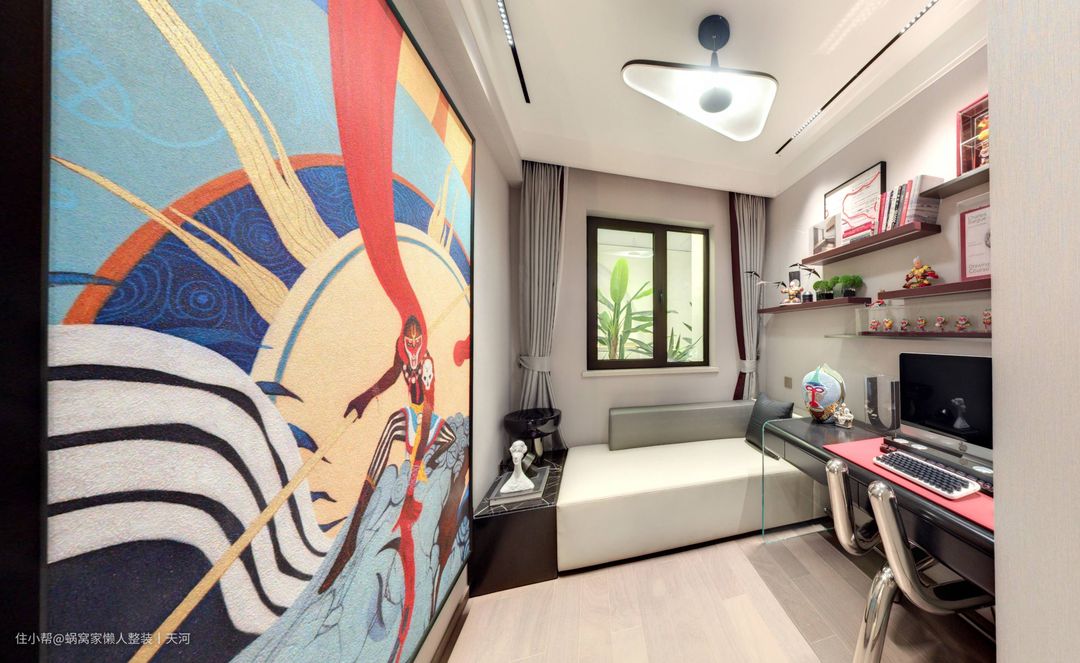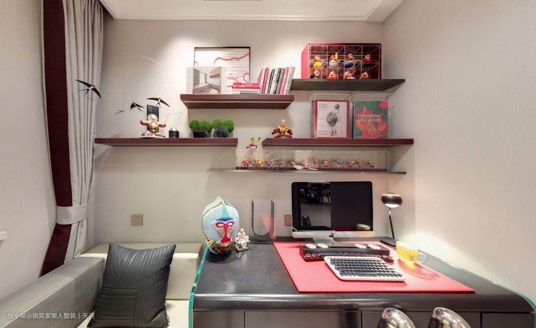 书房空间呈长方形,大采光的窗口结合灯光的设计,为书房带来了充足的采光;同时沙发的置入,还提高了书房空间的使用率。 定制书桌恰好填满这个小角落,结合长短不一的置物板,彰显出书房背景墙不凡的设计感。