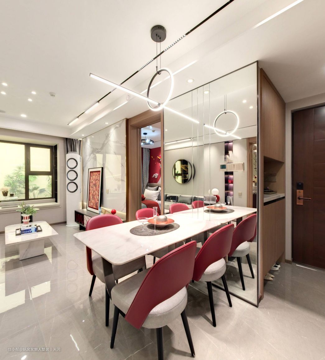 餐厅选用长椭圆形的餐桌,即实用又个性化十足。椭圆桌角的设计安全性更高,搭配光滑的板材桌面,抗油污性能增强,方便业主打扫。 餐厅灯光设计也十分具有艺术感,主灯+辅助灯光的设计,不仅丰富了餐厅的采光照明需求,还拉伸了整个餐厅的用餐格调。