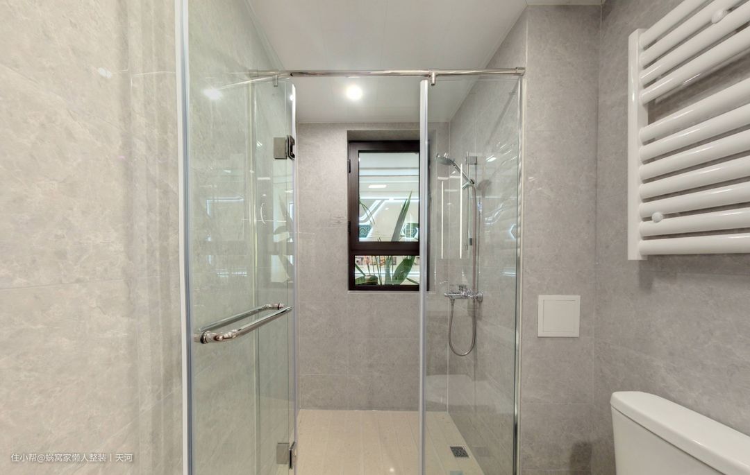 次卫呈长方形,所以设计师将各个功能区布局在一条直线上,明确生活动线。 镜柜的的置入,扩展收纳空间,玻璃制成的镜柜,表面有利于防潮,还能满足业主洗漱时照镜子的需求!! 玻璃防爆门打造的干湿分离,为业主保留了单独的淋浴区,提高了卫生间的使用舒适度。