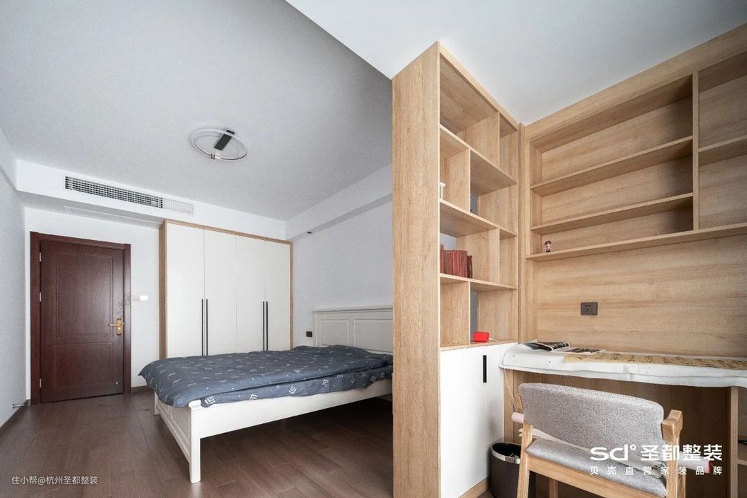 儿童房一改枫丹红的主色调,以奶油白与原木铺就而成,蕴含着清风拂山岗的温柔与坚定。