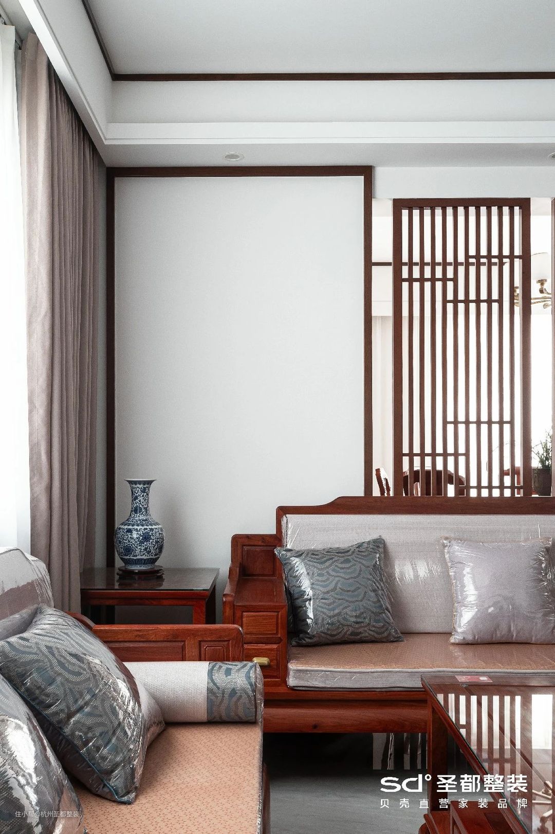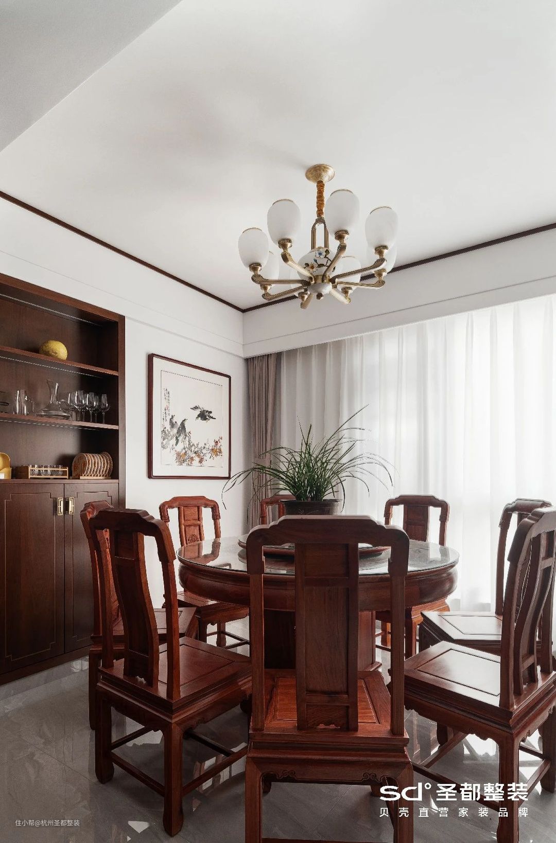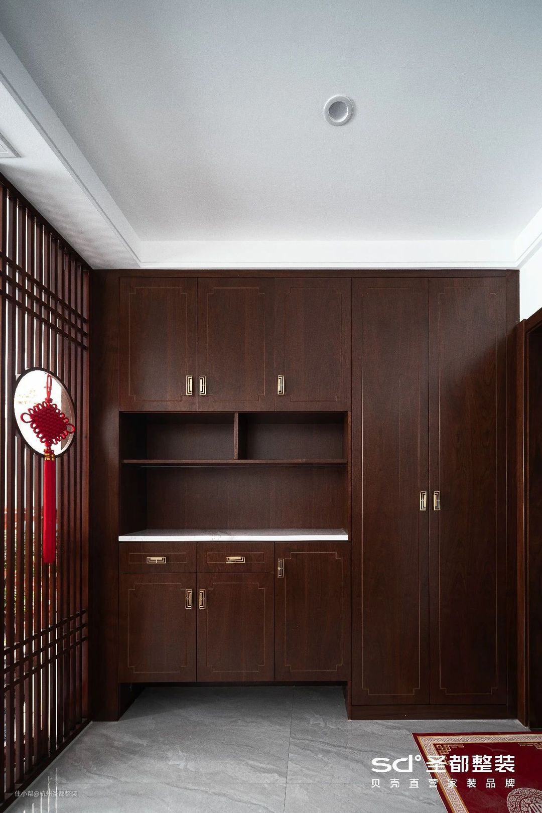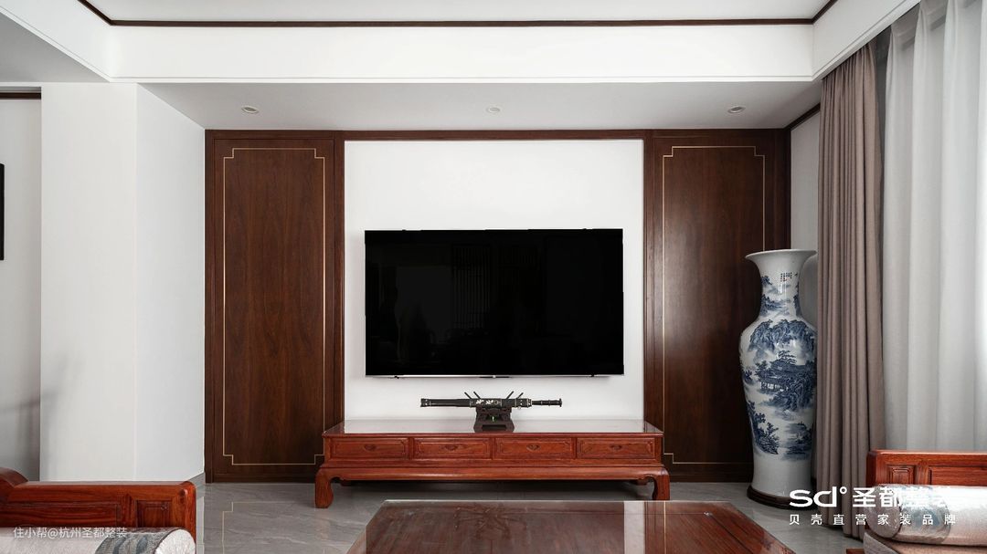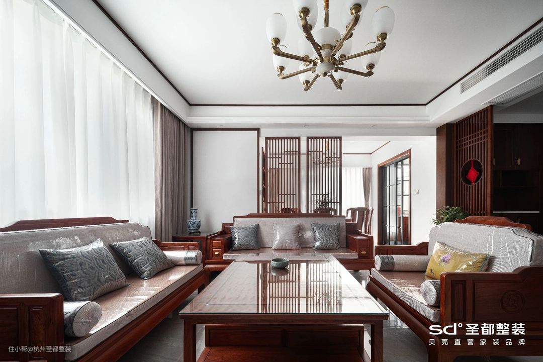 传统的中式设计讲究平和与稳重,设计师在此基础上融入了大理石、布艺等现代元素,并选用中国红加以点缀,以无声胜有声,给人以“言有尽而意无穷”旷远意境。