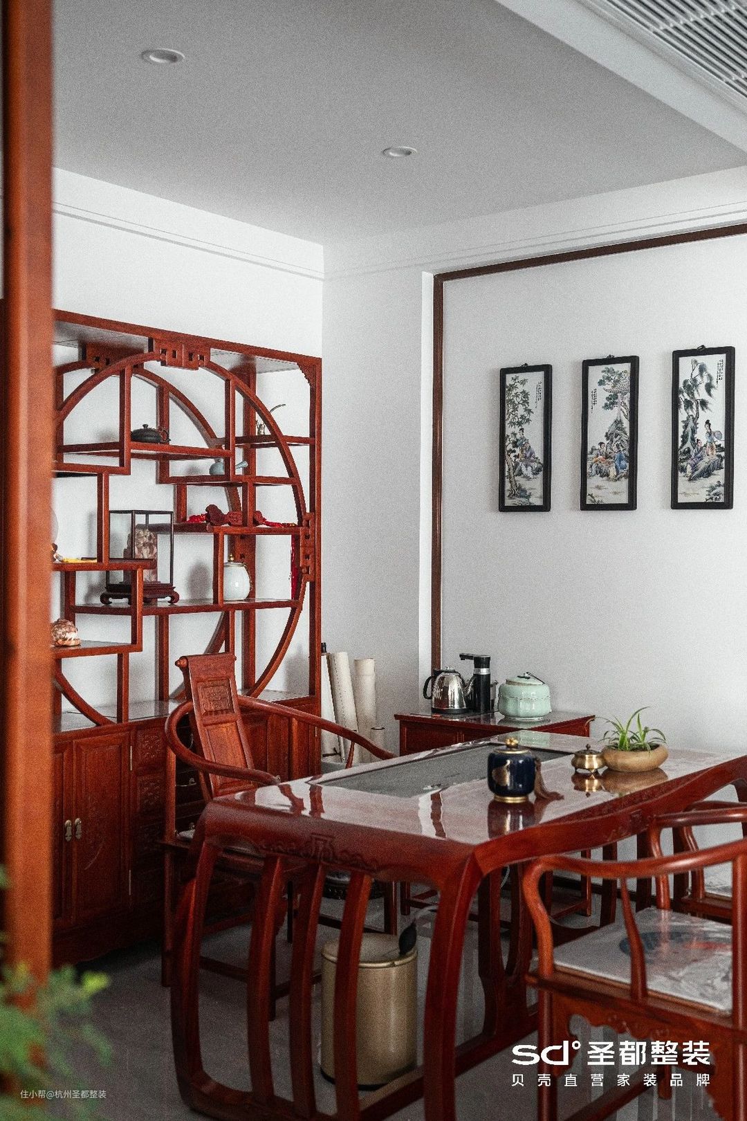 由于业主夫妻俩爱茶成痴,设计师特意在动区开辟一方茶室。 偶有闲暇,暂抛尘世的繁杂,于此烹一盏香茶,感受“万水千山看过,淡泊宁静于胸”的豁达,让寻常日子也能活色生香。