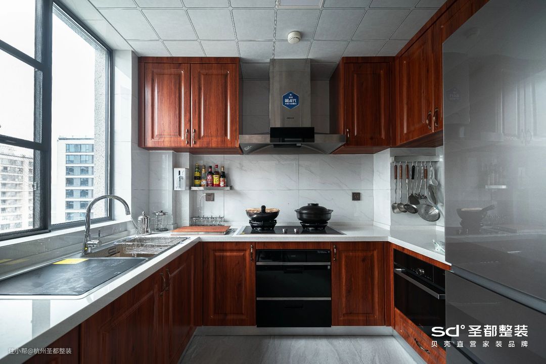 厨房延续客厅主色调,保证整体的和谐统一;U型布局+嵌入式家电,最大化提高空间利用率。