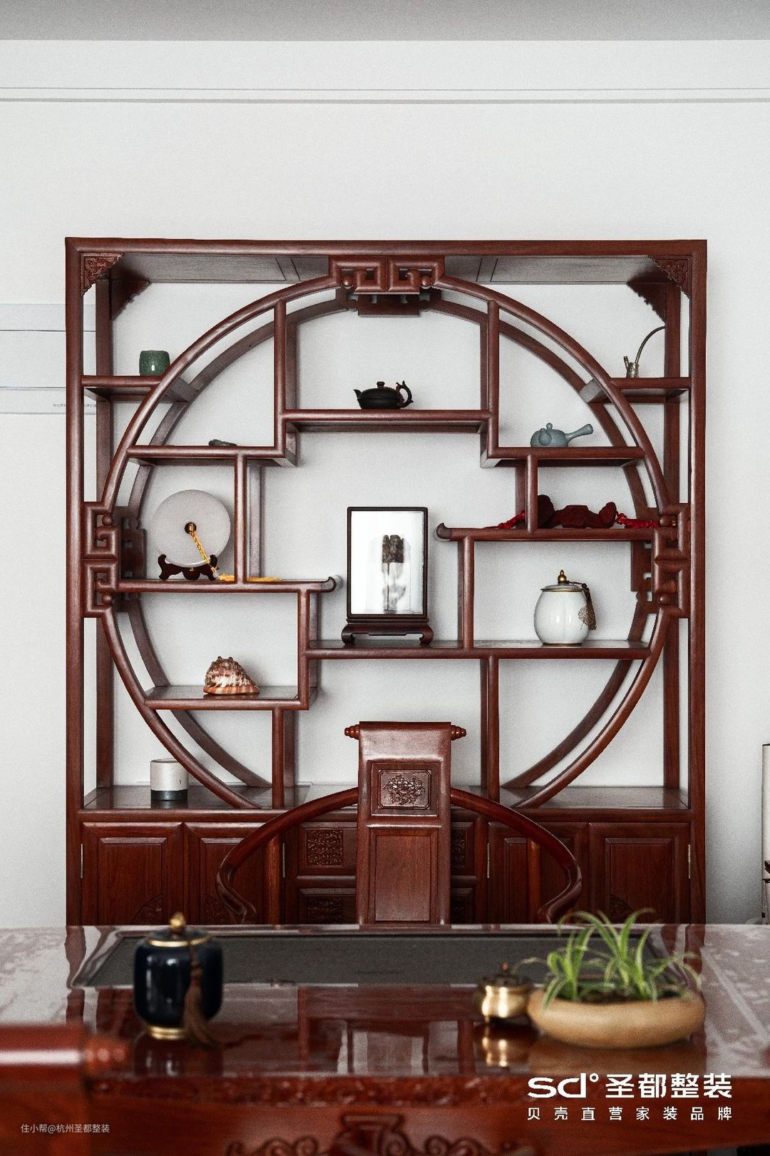 推开门扉的一瞬,一抹枫丹红跃入眼帘,一侧的镂空中式隔断古朴大气,典雅中不失温暖,端庄却不显沉闷,为居室奠定下邈远雅致的空间基调。