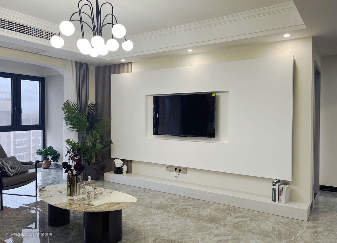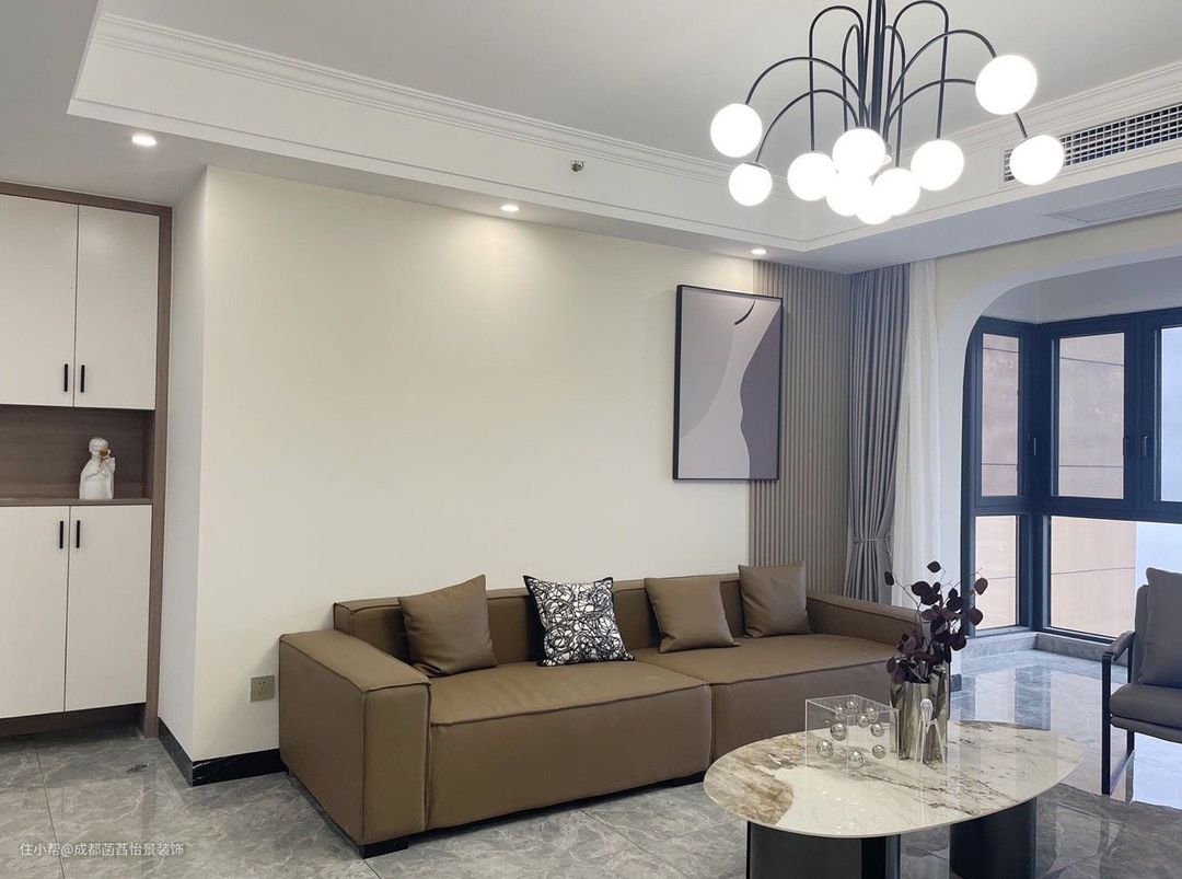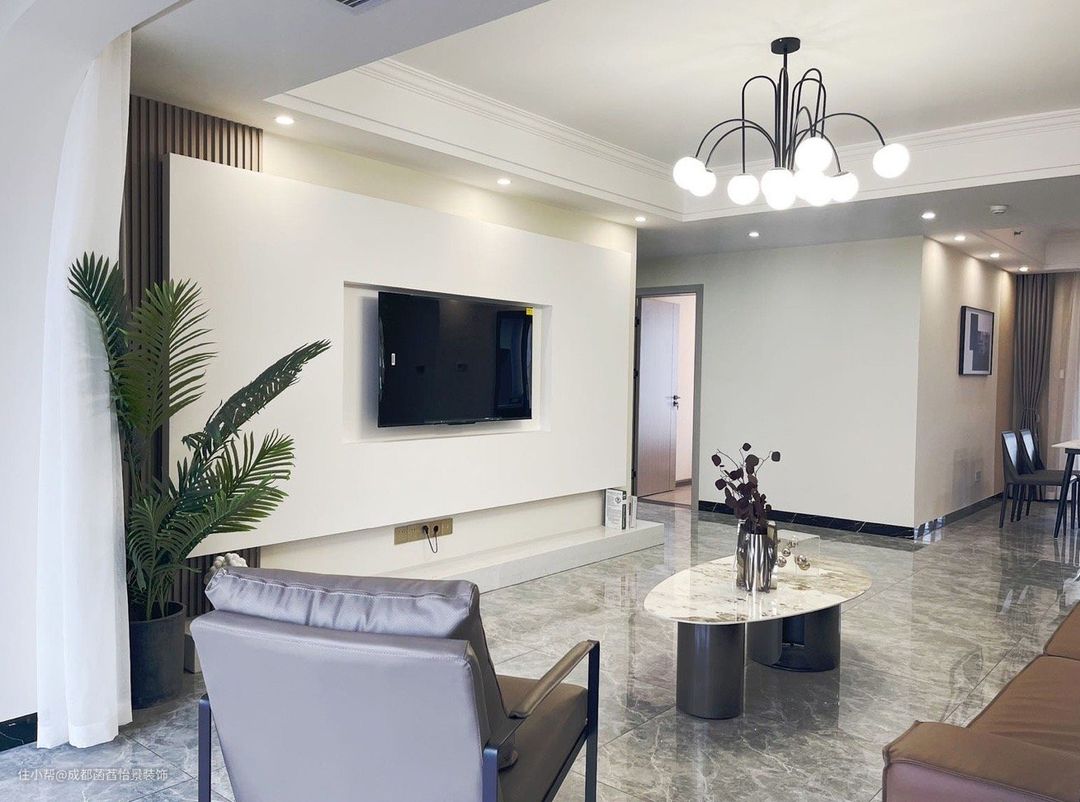 客厅和阳台打通,灰色大板地砖通铺,视觉延伸更高级。电视背景墙做了简单造型,木栅栏装饰加调色,简约干净。