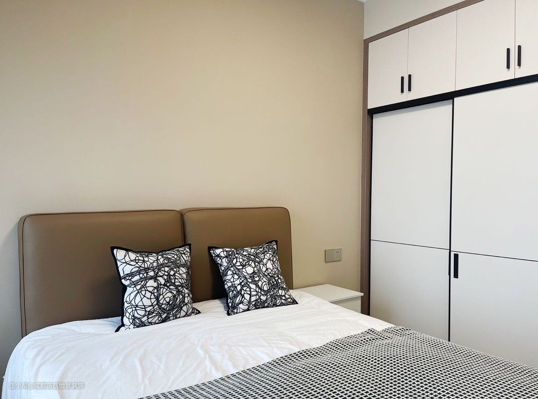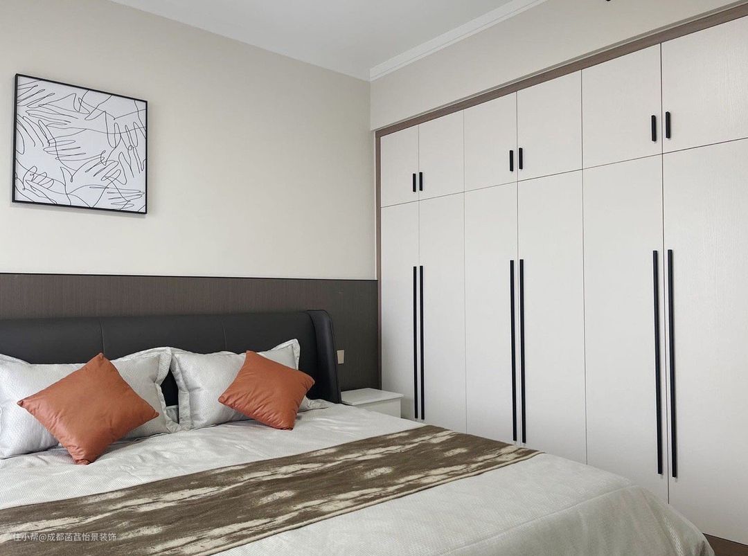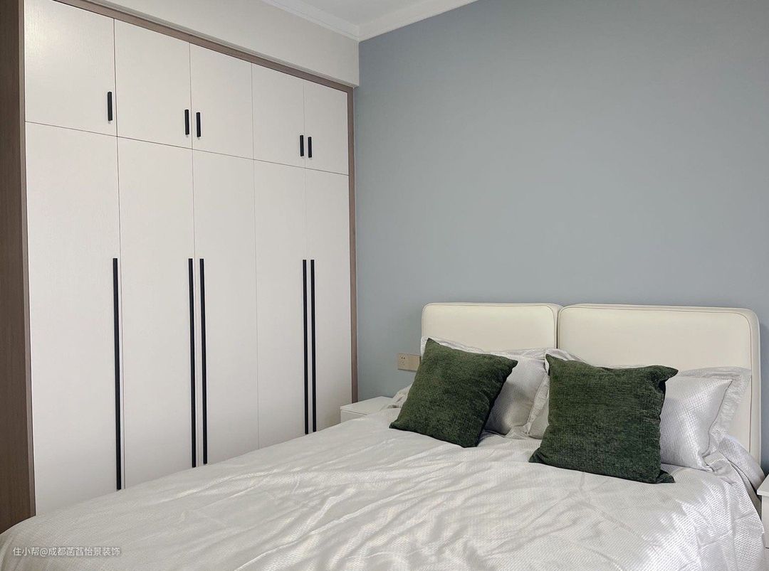 次卧床头背景墙也做了环保乳胶漆调色,利用侧边墙做了定制衣柜增加收纳,通顶设计不落灰减少卫生死角。