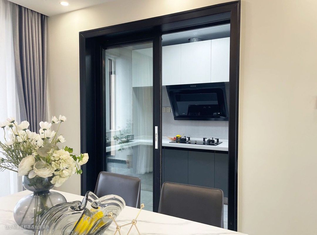 餐桌背后就是厨房,做的L型操作台,动线流畅,吊柜和地柜都做,增加收纳。