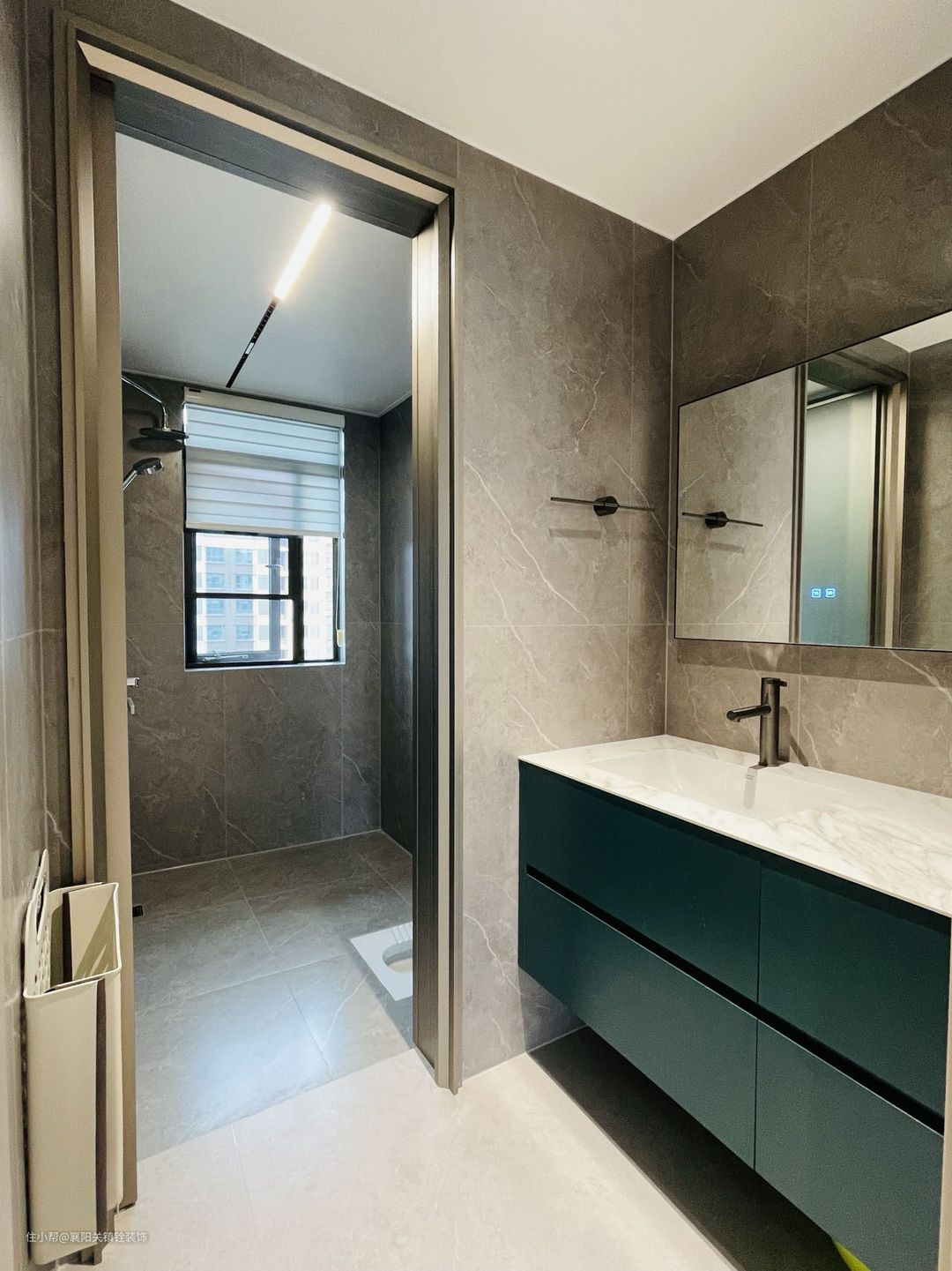 卫生间我们设计了干湿分离,通过窄边玻璃推拉门进行分隔,洗手台选择跳跃的宝石绿,台面搭配白色大理石,更具生活的氛围感