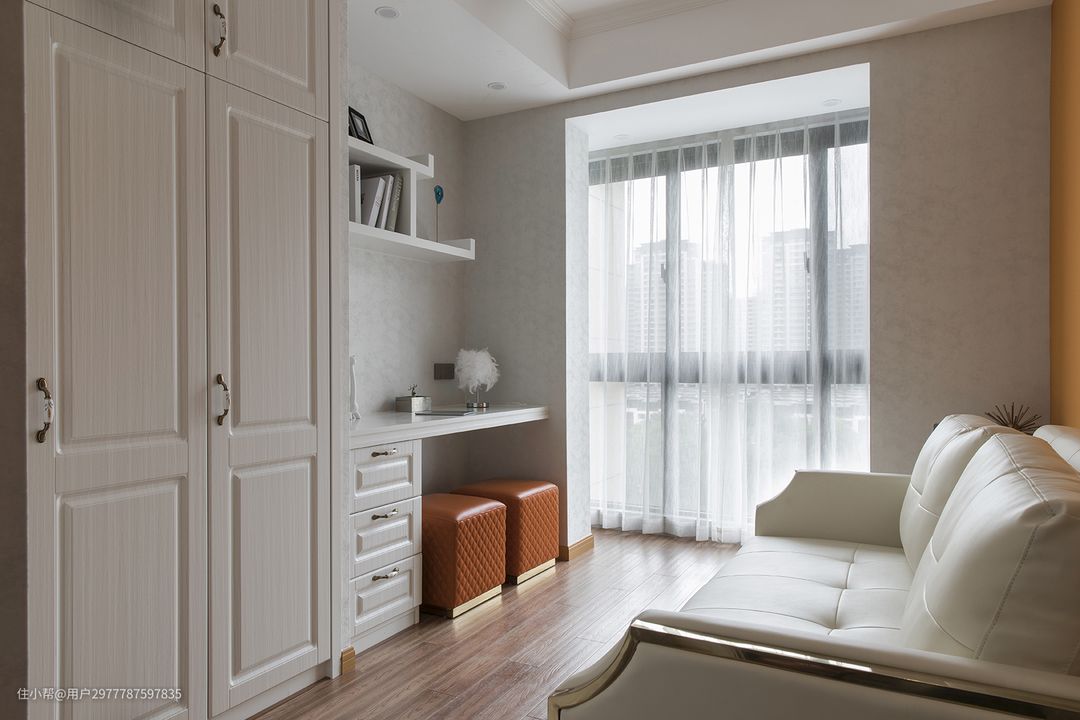 卧室独具一格,曹设计师将天花板打造成夜晚星空的样子,藏蓝的天花板如夜空,繁星点缀,橙色的床让人眼前一亮,加州好心情随之而来。 壁纸和挂画是吕先生在实体店购买的,黑白灰的色调非常符合整体美式的氛围,全体软包的床体让人有满满的安全感,羽毛落地灯、小动物摆件、圆墩墩的床头柜,每一个细节貌离神合,符合吕先生轻奢的风格需求。 休闲区阳台摆放梳妆台打造成化妆间,阳光一级棒,什么智能补光化妆镜统统不需要,一面简单的大镜子就够了。