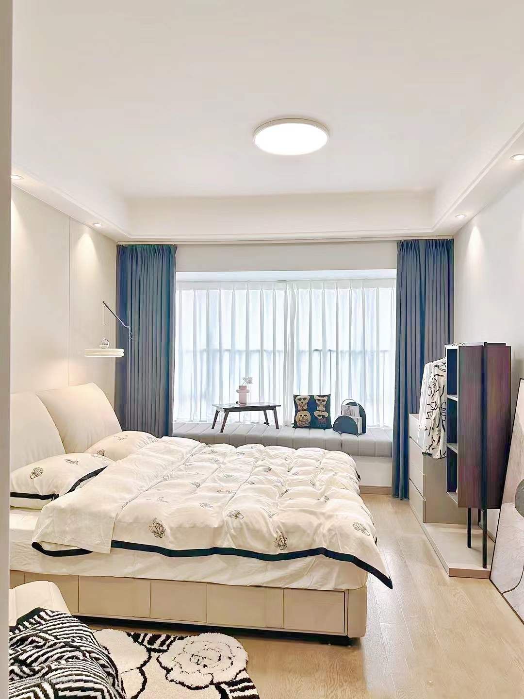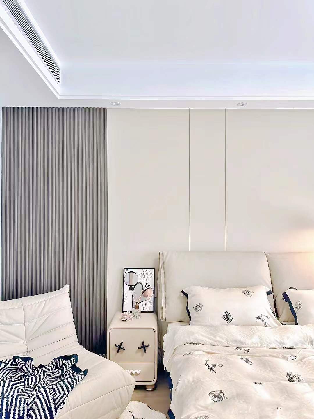 一圈简单的双眼皮吊顶,宽25公分,下吊32公分,空调出风口刷黑。大面积是浅灰色的墙布。背景墙是木格删+奶咖色的硬包。没有复杂的造型,简简单单的也可以很高级的很温馨。
