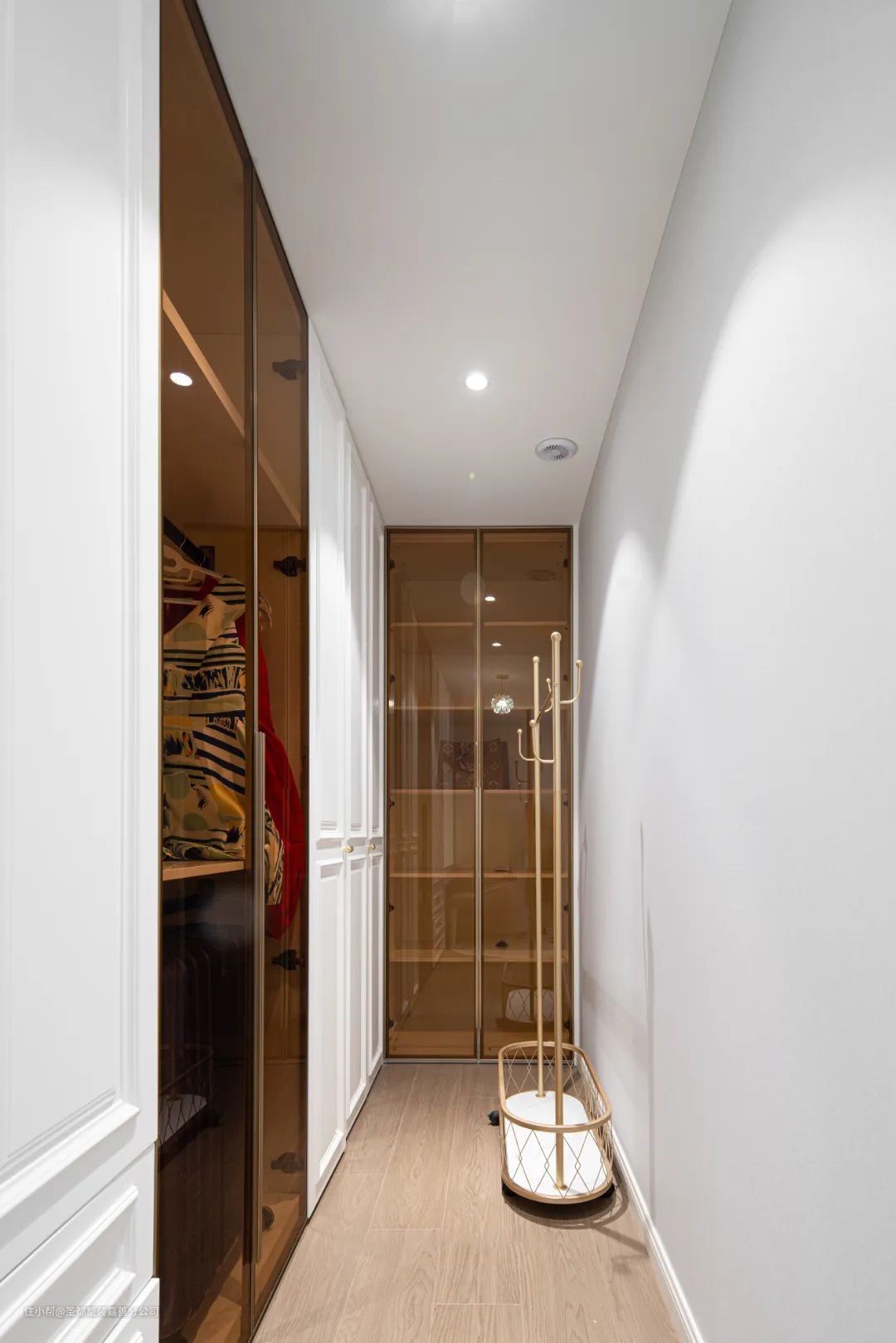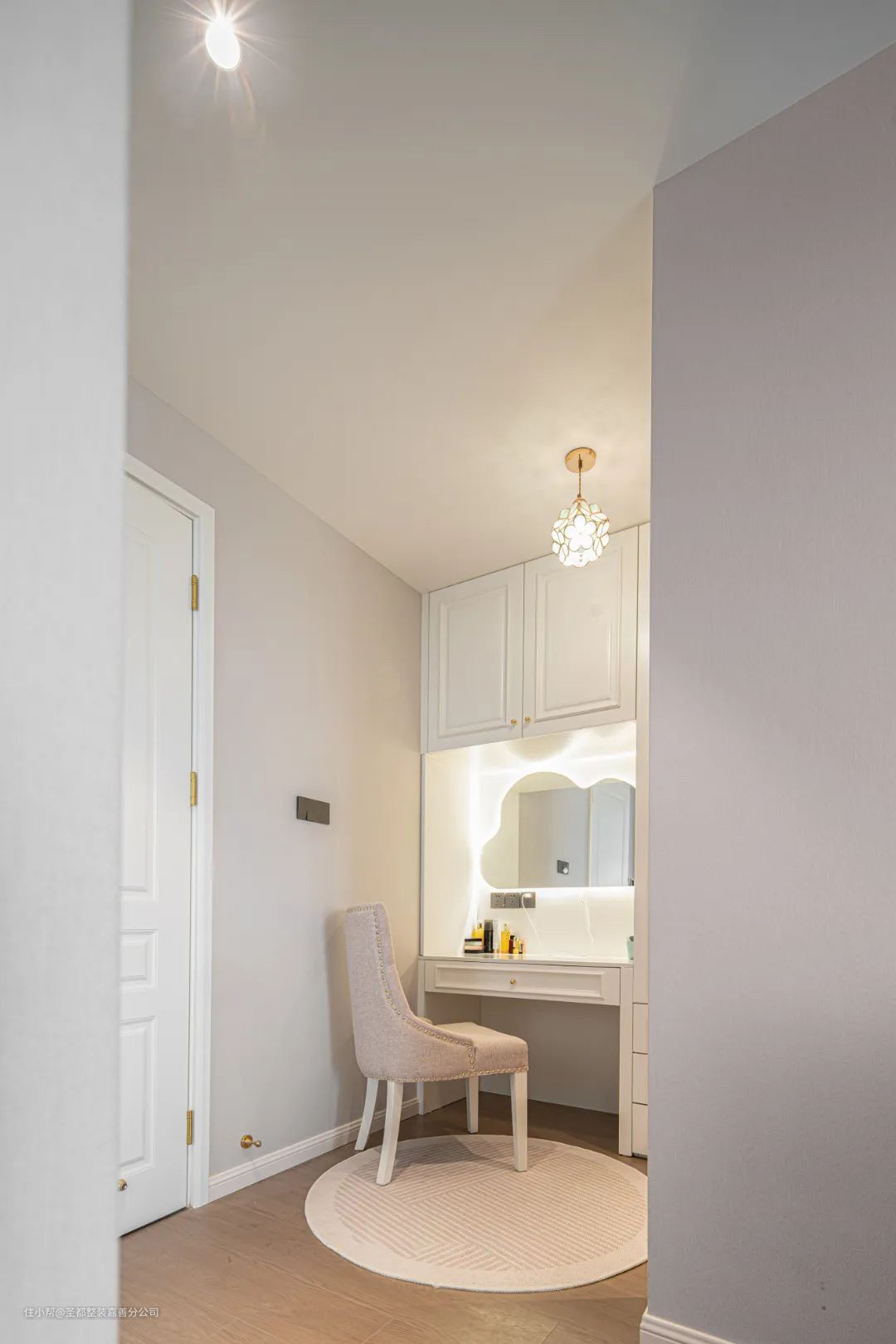 主卧彰显了法式温柔气质,浪漫粉皮质软包床与同色系床头柜,将法式的浪漫优雅与现代的简洁感融合,给居室带来浪漫柔和的气息。主卧里还暗藏步入式衣帽间,L型布局充分利用角落空间。衣帽间一侧设计成梳妆台,使用更方便。