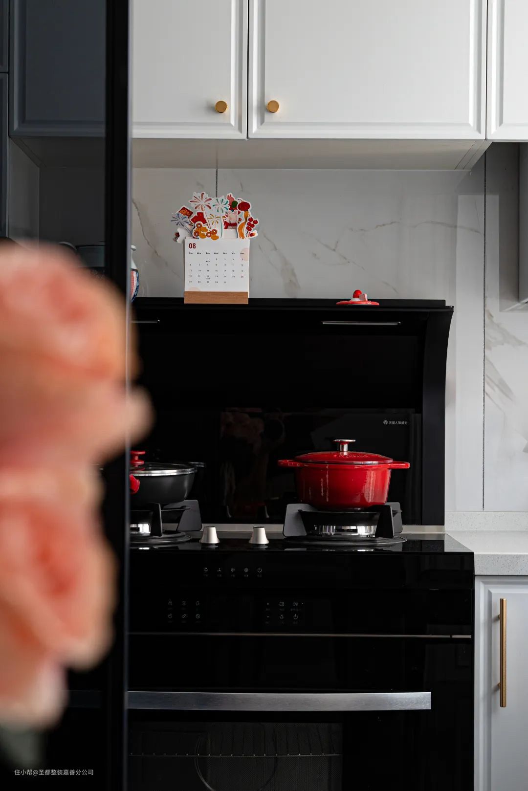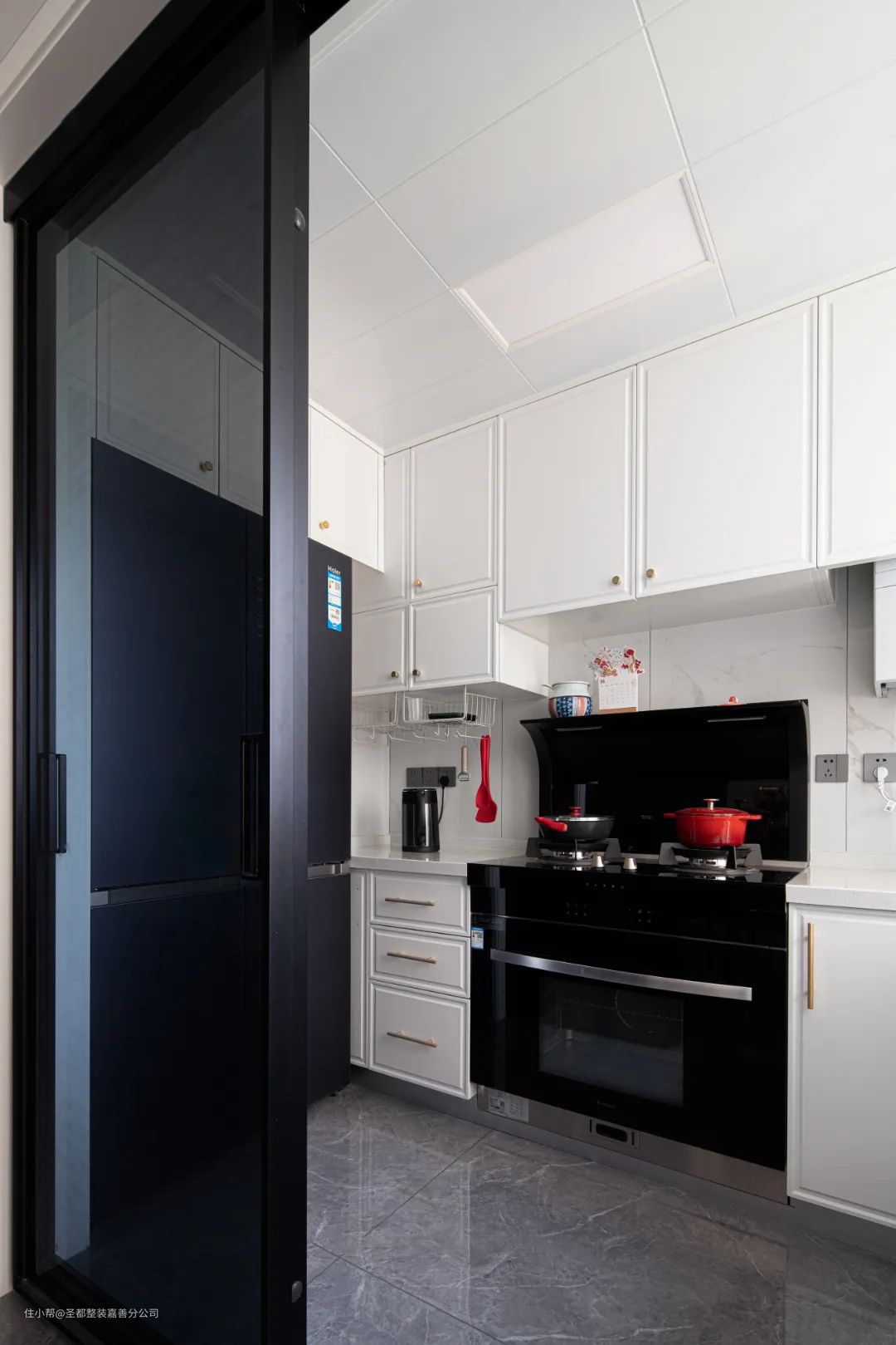 厨房与餐厅以长虹玻璃门作为隔断,透而不通,兼顾空间延伸感和实用性,橱柜是经典耐看的黑白色系,地砖选用同款浅灰色大理石纹砖,不经意间提升空间的精致感
