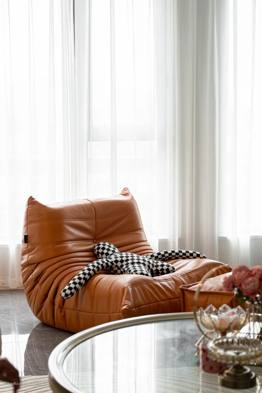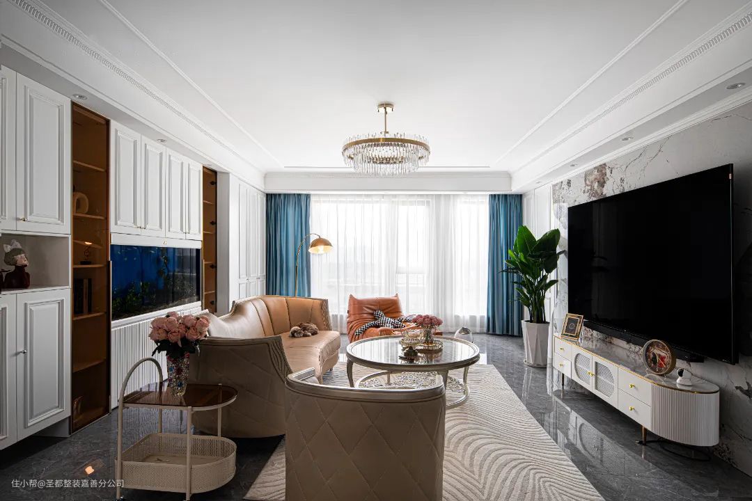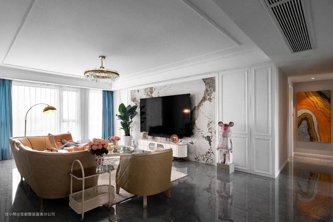 电视背景墙摒弃繁复的外观造型,采用对称的石膏线条,将法式风格简化,中间以大理石做背景,既保证了视觉上的明净简约,同时又带有一些灵动的变化。设计师在阳台一侧做隐形门设计,作为日常生活阳台使用,保障客厅空间的美观。 金色的吊灯、亮眼橙色懒人沙发、透明玻璃茶几,明快的色相对比,营造出独特的法式风情,使冷峻的空间中多了一种优雅复古的格调,每一处都是满满的高级质感。 玄关柜、阳台柜以及整面式的展示柜,充分展现对于空间的极致利用,收纳力满分。