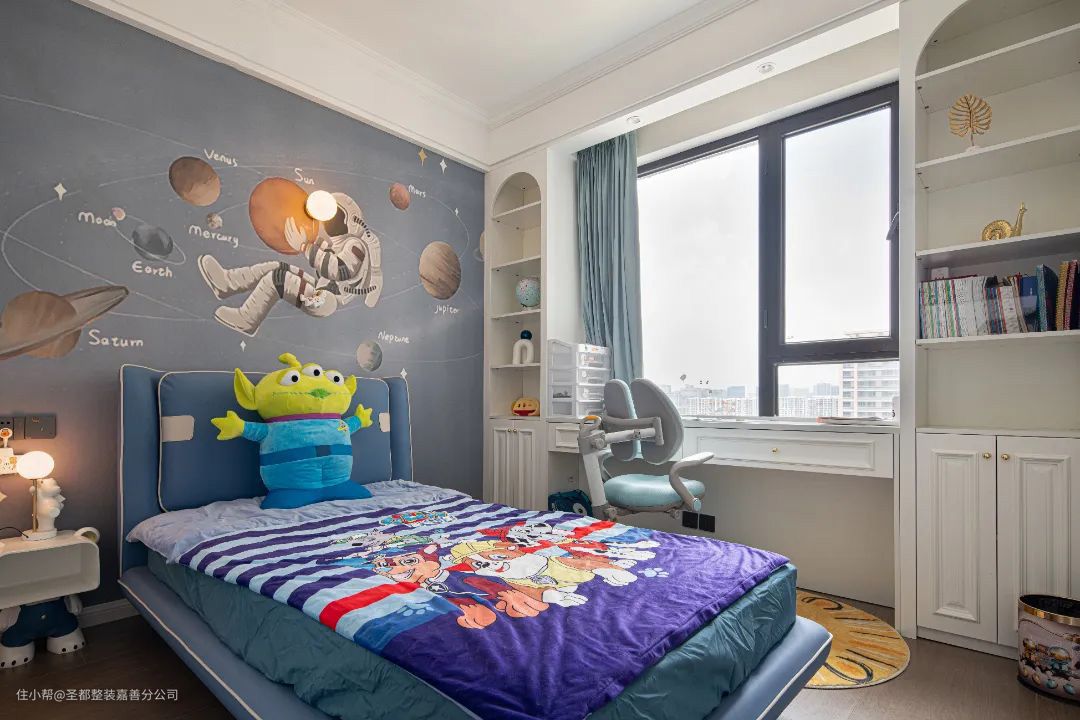 宇航员星空背景墙让空间显得更加梦幻,萌趣摆件为房间增添了一份童趣,极具收纳功能与颜值并存的定制柜,使整个房间整洁舒适。