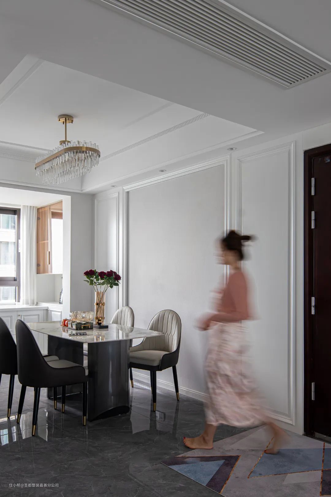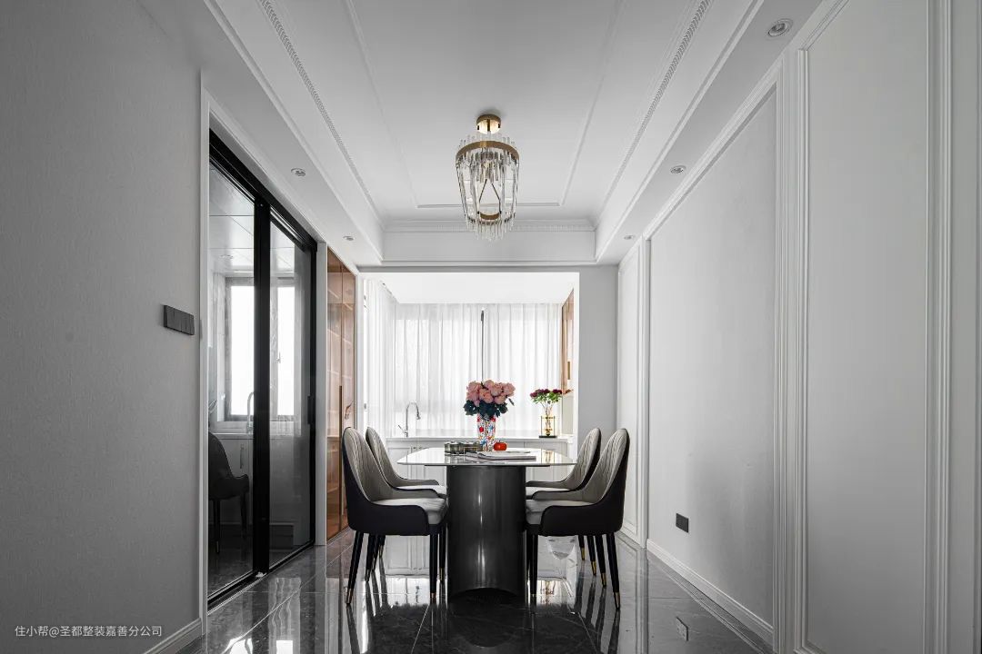 餐厅延续了客厅的色调,与客厅形成一个整体,舒适的双面皮质餐椅搭配白色大理石餐桌和环状水晶吊灯,打造出一个法式轻奢主义的空间格调,家人围坐享受幸福用餐时光。