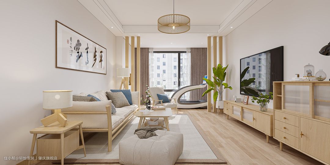 日式原木暖色系的客厅让家处处流淌着岁月静好的温馨,整个空间都充满舒适感,大量原木软装让整个家清新自然。 阳台与客厅打通,并利用墙体做定制柜,极大扩大了整个家的收纳力,春色背景墙搭配书法字画,整个空间都洋溢着书香气息,起到点睛之笔作用。 暖色木地板搭配纯白色墙体,配上原木沙发与浅米色沙发垫呼应,让整个空间都十分和谐,蓝色的沙发枕在整个淡雅空间中,一下子跳脱了出来,起到了点睛之笔。