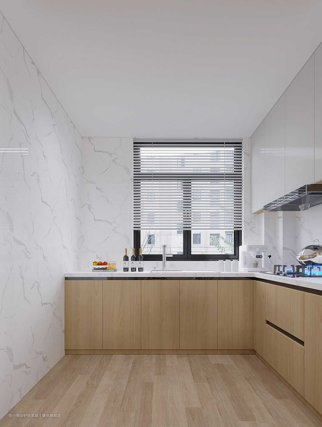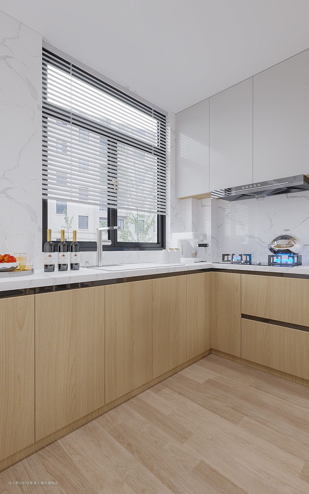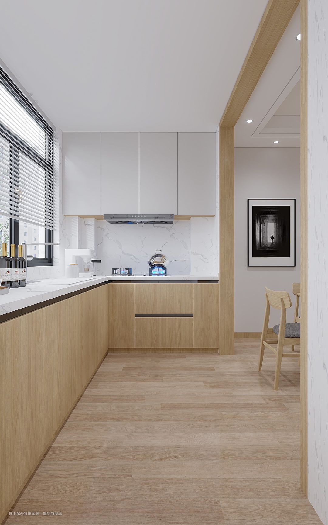 开放式厨房+岛台,设计感拉满,L形空间布局,动线流畅,采光和通风也极好,墙面采用大理石纹瓷砖,方便清理打扫,与木纹地板和橱柜呼应,高级感满满。