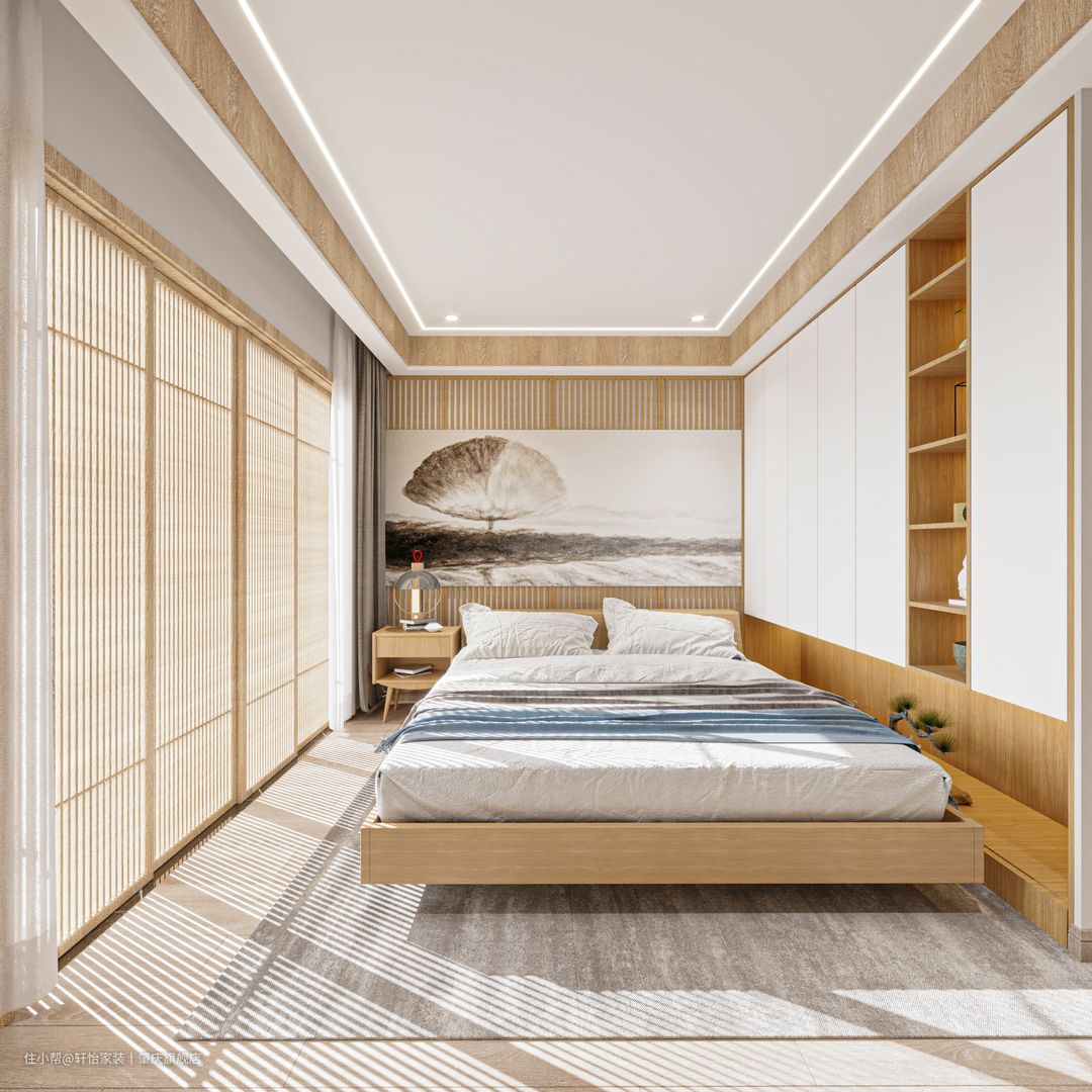 温润的木色+白色搭配,简约且统一,墙面颜色与白墙颜色呼应,地板与床头都是相互接近的原木色,整体这种白色+原木的空间搭配,温柔治愈不失质感,仿佛进入到田园自然之中。 整面落地窗让室内采光视野极好,床头背景墙采用大面积木框+书法画,与落地窗呼应简直堪称一绝。在这样的空间哪怕是发呆都是幸福! 顶天立地的衣柜收纳力极强,再多衣服都可以轻松收纳,原木展示柜的出现为整面衣柜也增加特色,不会显得大面积白柜而沉闷。