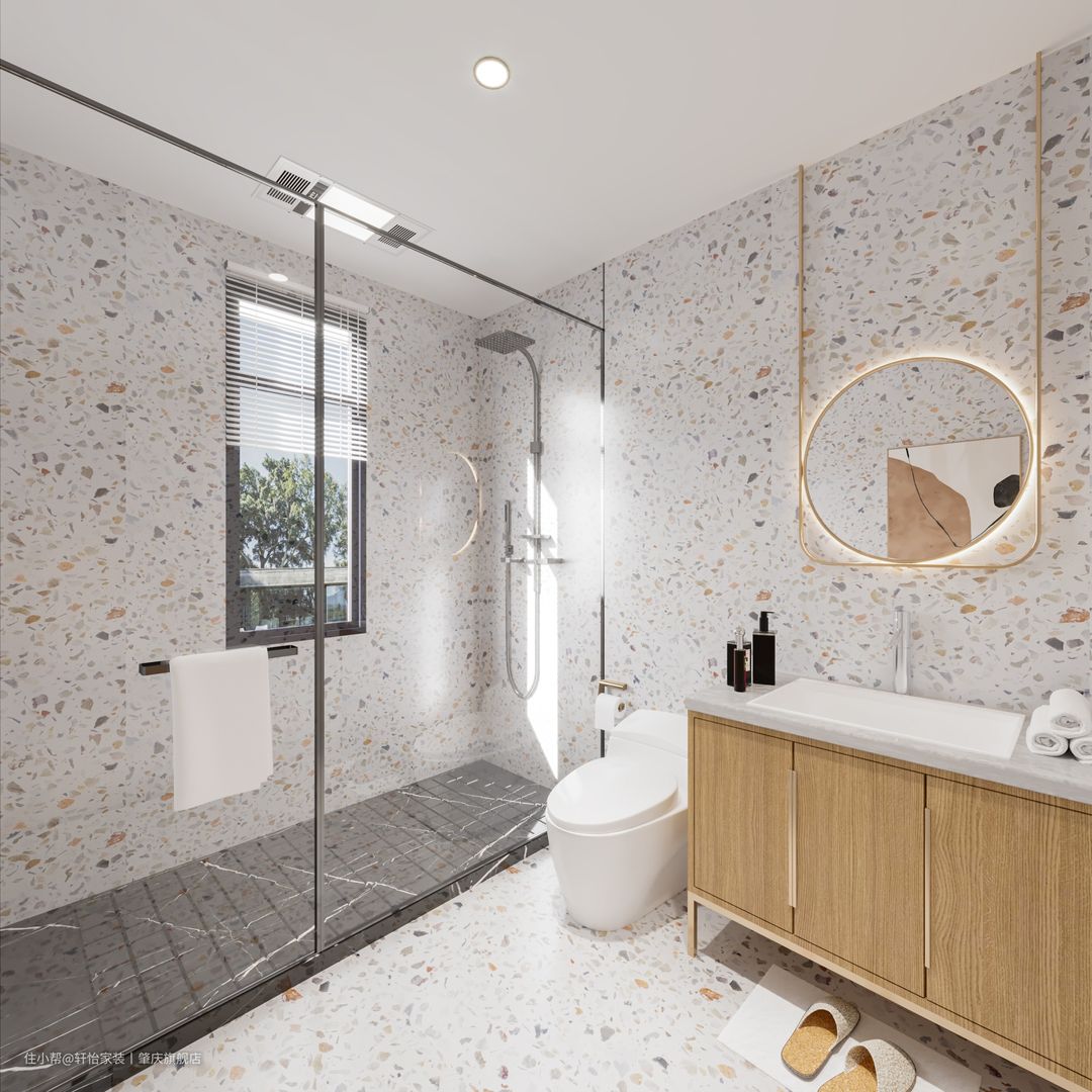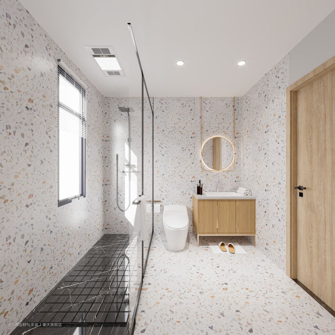 采用干湿分离设计,简洁大方,功能划分明确使用起来十分方便。洗漱台盆上的镜子装了灯带构成丰富的光源系统。 原木色门与台盆柜颜色一致,为整个空间起到呼应作用。 整个空间宽敞明亮,即提高舒适度也非常方便清洁,日常打理容易。